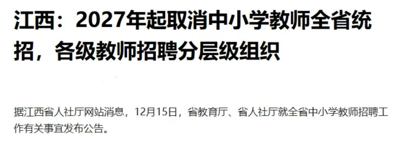 而如今,江西省又传来了一个“坏消息”——根据江西省人社厅12月份发布的“全省中小学教师招聘工作有关事宜”的公告中明确道:到了2027年起,将取消中小学捷爱士全省统招,各级教师招聘分层级组织。