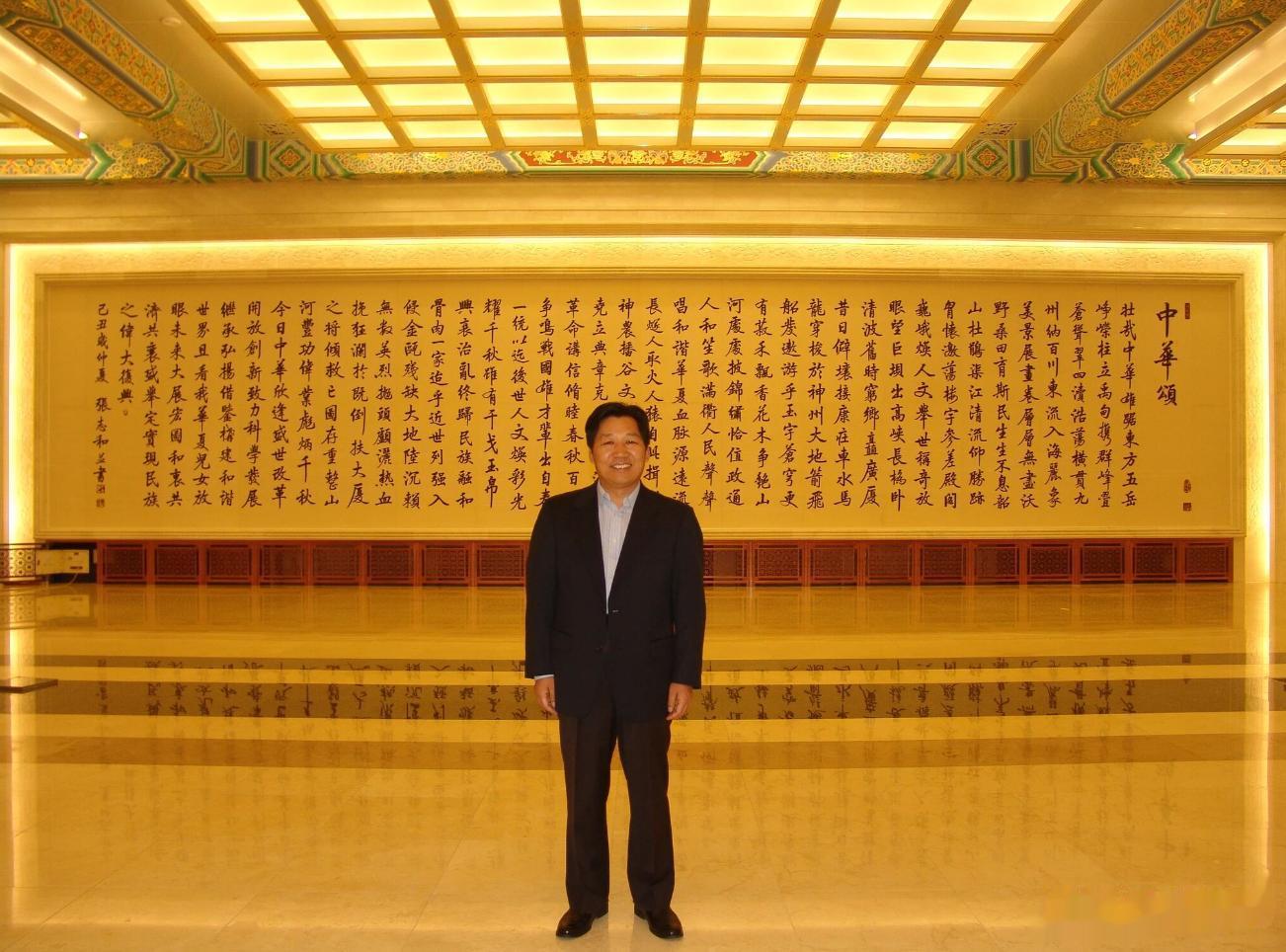2009年,恰逢新中国成立60周年,人民大会堂金色大厅重新装饰,张志和受邀创作一幅献礼书法作品。他不仅承担书写任务,还亲自撰文,历时一个月从两千余年的诗词歌赋中汲取养分,反复打磨后将初稿六百多字删减至298字。