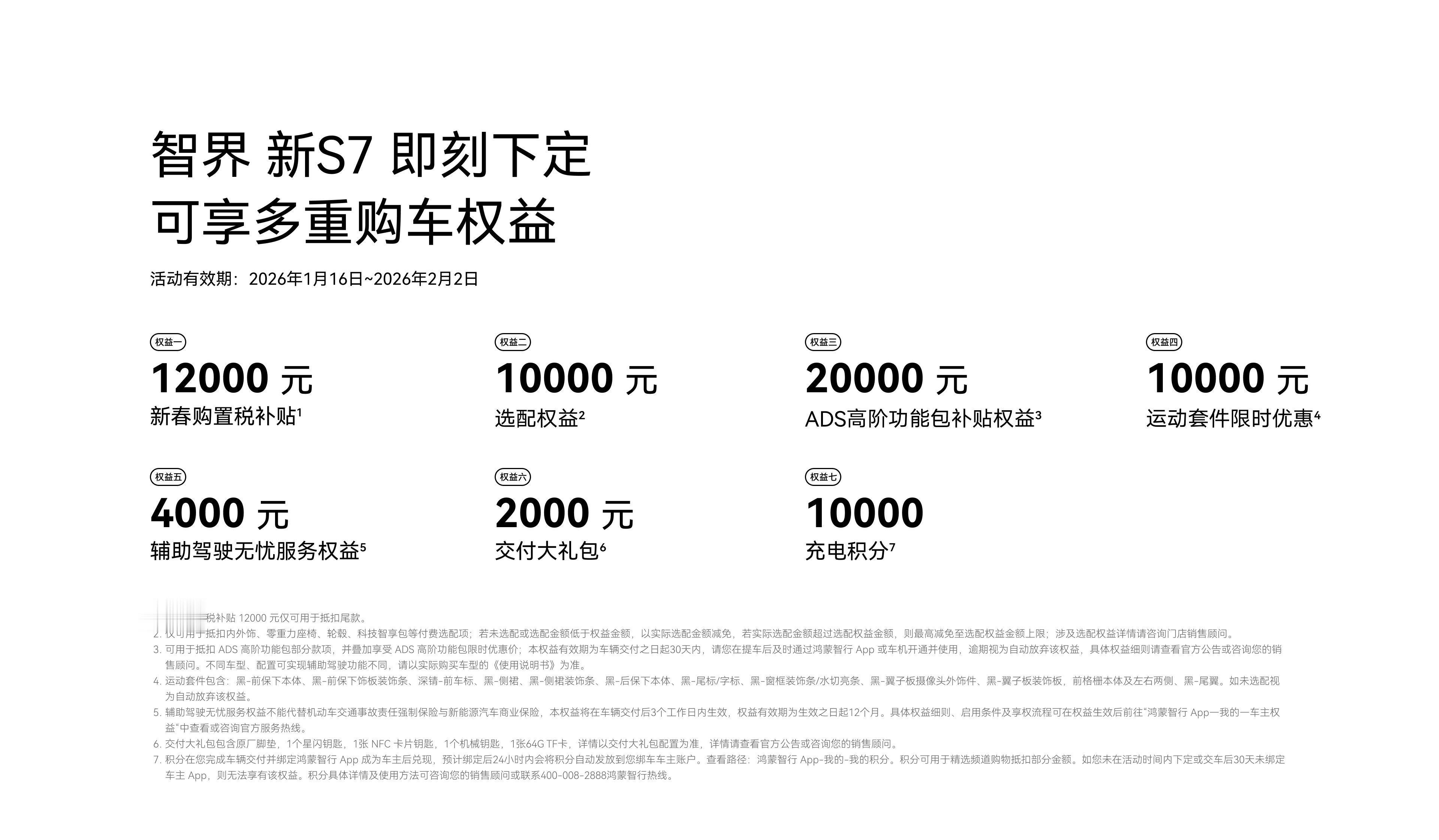 智界品牌热度一直挺高,路上见到的也越来越多了。赶上年末,它直接放出了实在的新春购车方案,全系车型都给最高12000元的购置税补贴。更重要的是,它的两款主力车型各有“加强包”,买智界R7的话,购车权益最高能到49000元;选择智界新S7,权益包价值更是高达59000元。年底这波诚意是看得见的。