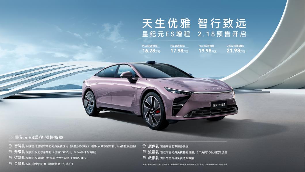 此次星纪元ES增程版共推出4款版型,分别为Plus舒适智享、Pro高速智驾、Max 城市智驾、Ultra 四驱旗舰,官方预售价16.28万元-21.98万元。预售期间下订,即刻享受七大权益,包含至高价值45000元的限时购车权益,分别为价值30000元NEP全场景智驾功能终身免费使用的智驾礼、价值10000元免费升级超享豪华包的升级礼、价值5000元免费升级晨曦红和极光紫个性外观色的炫彩礼,还有质保礼、流量礼、救援礼,更有5年0息金融方案的金融礼,将用户权益最大化。