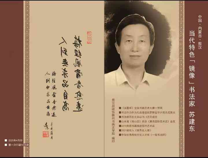 苏建东,艺名“地三鲜”,内蒙古敖汉旗政协新州书画文学院院士、中国当代特色“镜像”书法家,赤峰市书法家协会会员,自幼爱好书法,几十年来笔耕不辍,真、草、隶、篆及山水国画均有研习,特别是镜像(反书)书法更是精专,其作品被国内外各界广泛收藏。镜像(反书)书法始于南朝,代表作为南朝梁萧景神道阙著名刻石,清代晚期出土于南京,距今1600年。由于因镜像书法难以驾驭,故习书者不多,精道者更是少之。2011年,镜像反正书法作品《福禄寿喜》作为镜像书法代表作搭载神舟八号遨游太空。2022年,苏建东书法作品被外交部作为礼品赠送给俄罗斯驻中国大使馆大使安德烈·伊万诺维奇·杰尼索夫先生。苏建东的书法作品还被全国人大常委会委员、山西省大寨村党总支书记郭凤莲收藏。苏建东先后获得《中国当代特色书法名家》;2020年《国墨杯》全国书画艺术大赛中荣获“一等奖”;中国公益人物;二十一届中国世纪大采风2021采风人物;2021国际中国公益事业大典《我和我的祖国》特授予《2020年度中国当代特色书法名家》荣誉称号;2021年镜像书法《茶道》在北京中昌鼎源国际拍卖有限公司以17.25万元成交;2021年被写入《世界名人录》《沧海桑田中国巨变》特别推荐人民艺术家;名家推荐-2023书画名家百杰;2022年<美丽中国>授予《中国人民艺术家》荣誉称号;2022年《热血铸军魂,庆祝中国人民解放军建军95周年》被评《著名艺术家》;2023年CCTV央视书画频道签约艺术家;2024年获得《莫奈国际艺术奖》金奖的山水画《苍山恋》在英国罗素国际拍卖有限公司以32万元成交;2024年福禄寿喜摆件在香港国丰拍卖有限公司以人民币28.8万价格成交。同年6月一套书法册页在北京传世水墨拍卖会上以78.5万元成交,2024年9月,两幅镜像书法《宝地生金》和《仁义礼智信》在佳士得国际拍卖公司分别以26万元和22万元的价格成交;同年9月,一幅山水画《苍山恋》荣获《莫奈国际艺术奖》金奖。2025年10月21日,在香港康乾拍卖有限公司和英国罗素拍卖有限公司,镜像书法《宝地生金》《竹影清风,珠光素月》《苍山恋山水画》和《梅兰竹菊》四条幅,分别以62万元,38万元,66万元,和95万元的价格成交。大部分作品已被国内外各界收藏家,企业家收藏!