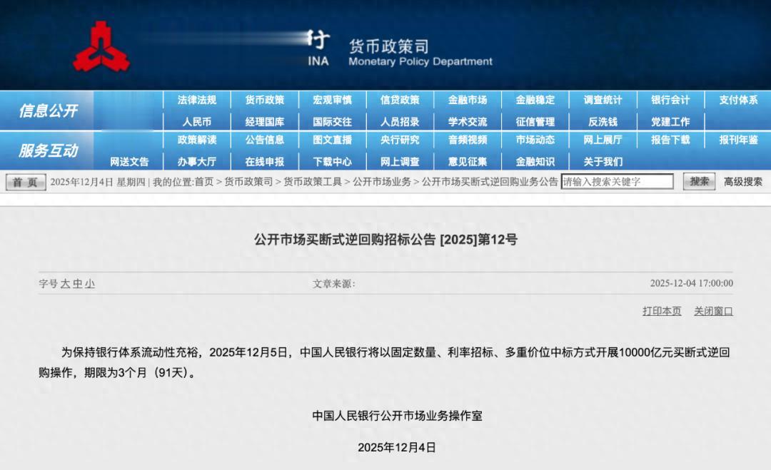 中国人民银行官网今天发布消息,为保持银行体系流动性充裕,2025年12月5日,中国人民银行将以固定数量、利率招标、多重价位中标方式开展10000亿元买断式逆回购操作,期限为3个月(91天)。