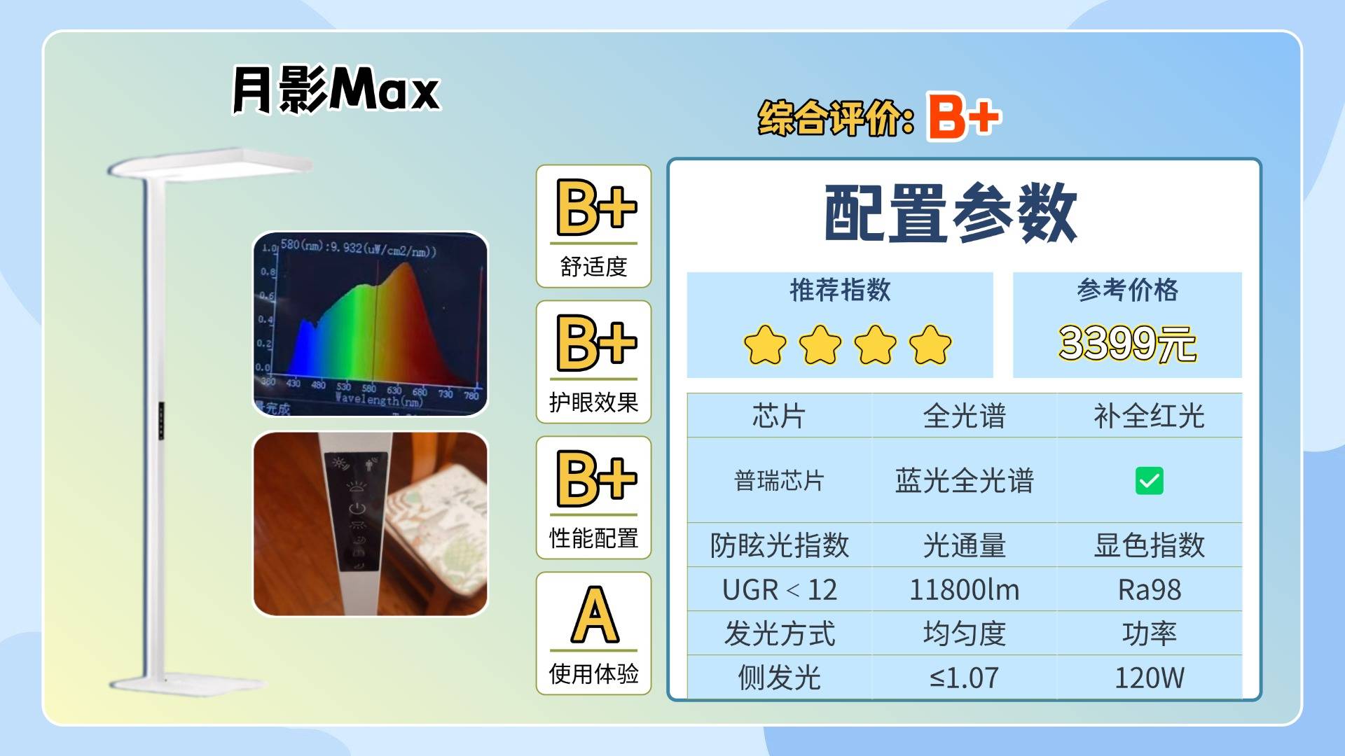 落地护眼大路灯的十大品牌有哪些?月影Max采用一体化发光面,结合360°环形侧发光结构,可释放约11800lm高光通量,光线强度充足且分布均匀,能轻松覆盖大面积阅读或工作区域,核心光源搭载全光谱灯珠与普瑞芯片,输出稳定无频闪,长时间使用也能有效降低视觉疲劳,材质方面,灯体采用航空级铝合金,质感细腻、工艺精致,整体做工表现亮眼,但设计上也有不足,灯杆为尖角造型,握持时可能略显生硬,同时对有孩子的家庭来说,存在一定安全隐患。