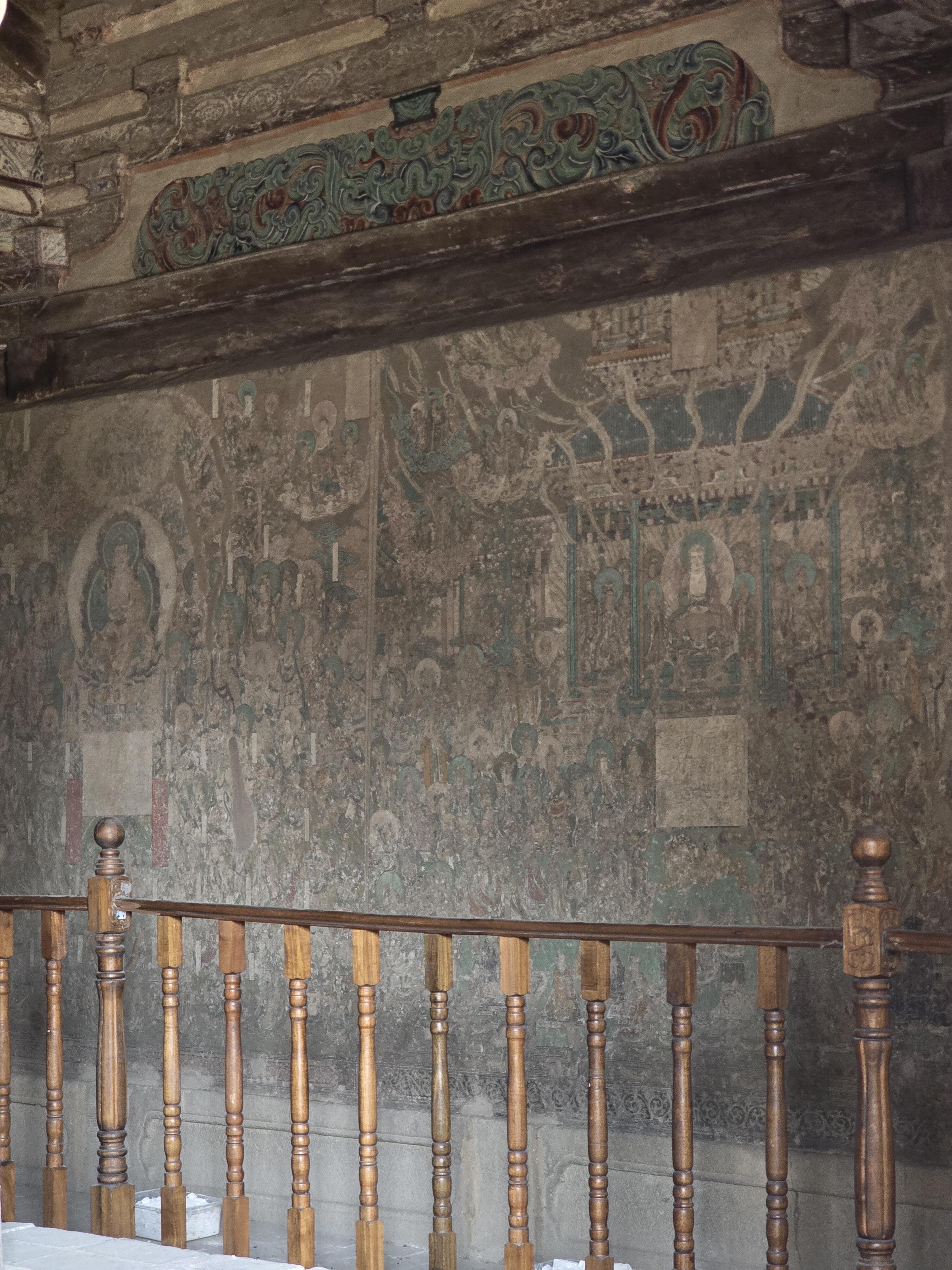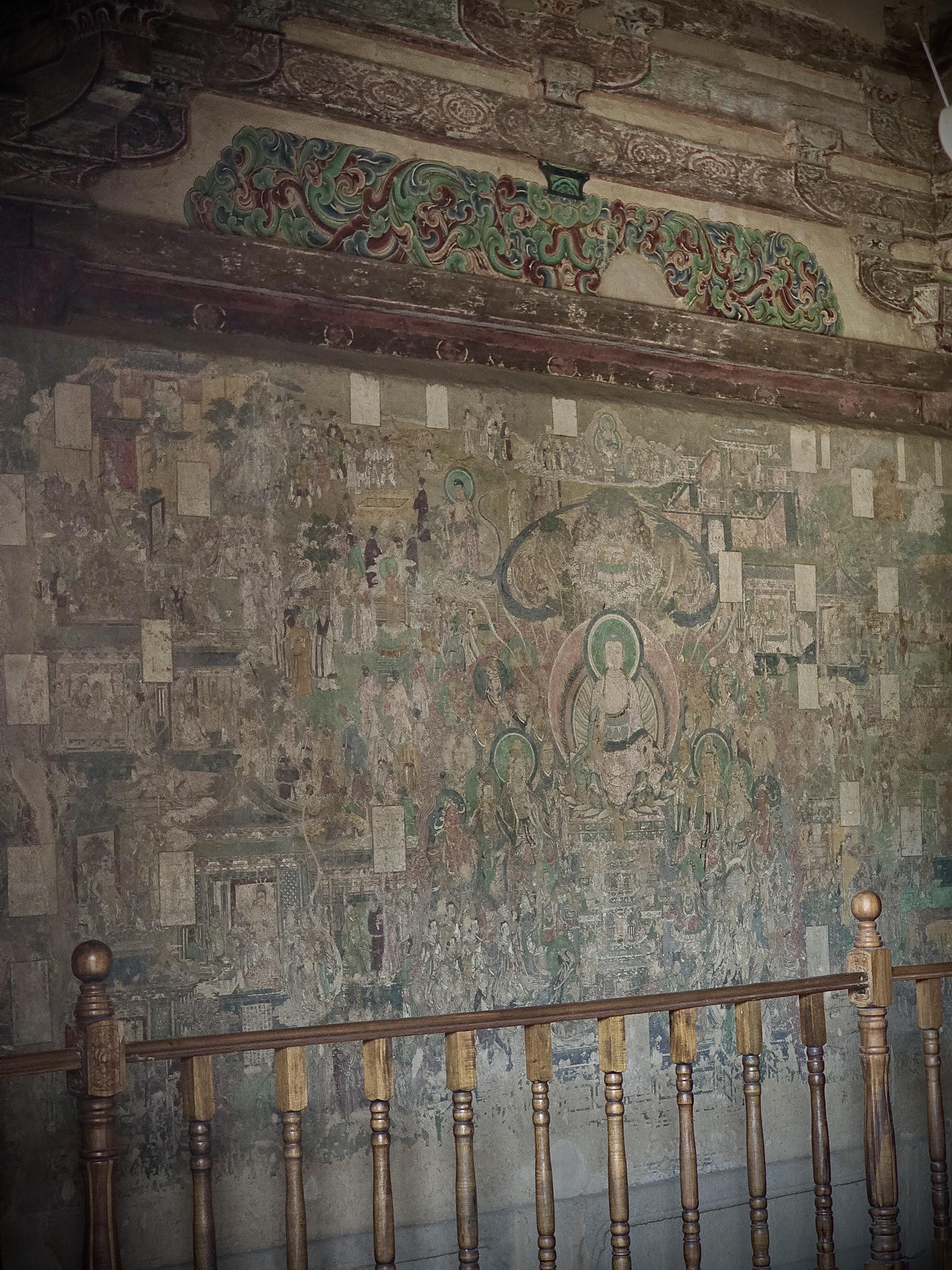 不过真正让开化寺“出圈”的,还是大雄宝殿里那三面墙的壁画。1950年代,文物普查队第一次走进这座佛殿时,手电筒的光刚扫过墙面,队员们就倒吸了一口凉气:壁画上的人物居然还带着光泽,大红大绿的色彩像刚涂上去似的,连衣褶里的金线都还闪着光。后来才知道,画师郭发用了“沥粉贴金”的技法,先在墙上堆出细细的粉线勾勒轮廓,再往上贴金箔,难怪过了近千年,这些人物还是“珠光宝气”的。可比起技法,更让人拍案叫绝的是壁画里的“烟火气”——明明画的是《大方便佛报恩经变相》,讲的是释迦牟尼前世今生行孝的故事,郭发却偷偷把大宋的市井生活“塞”了进去。