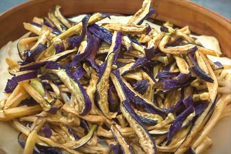 4、清洗晒干的茄子,放入蒸锅中,大火蒸10~15分钟,然后装到大碗里。加入适量食盐、米酒、蒜末、辣椒酱、干辣椒、酱油,再浇上一碗热油激发出香味,带上手套后,用手将每一条晒茄子都搓拌均匀就大功告成啦!