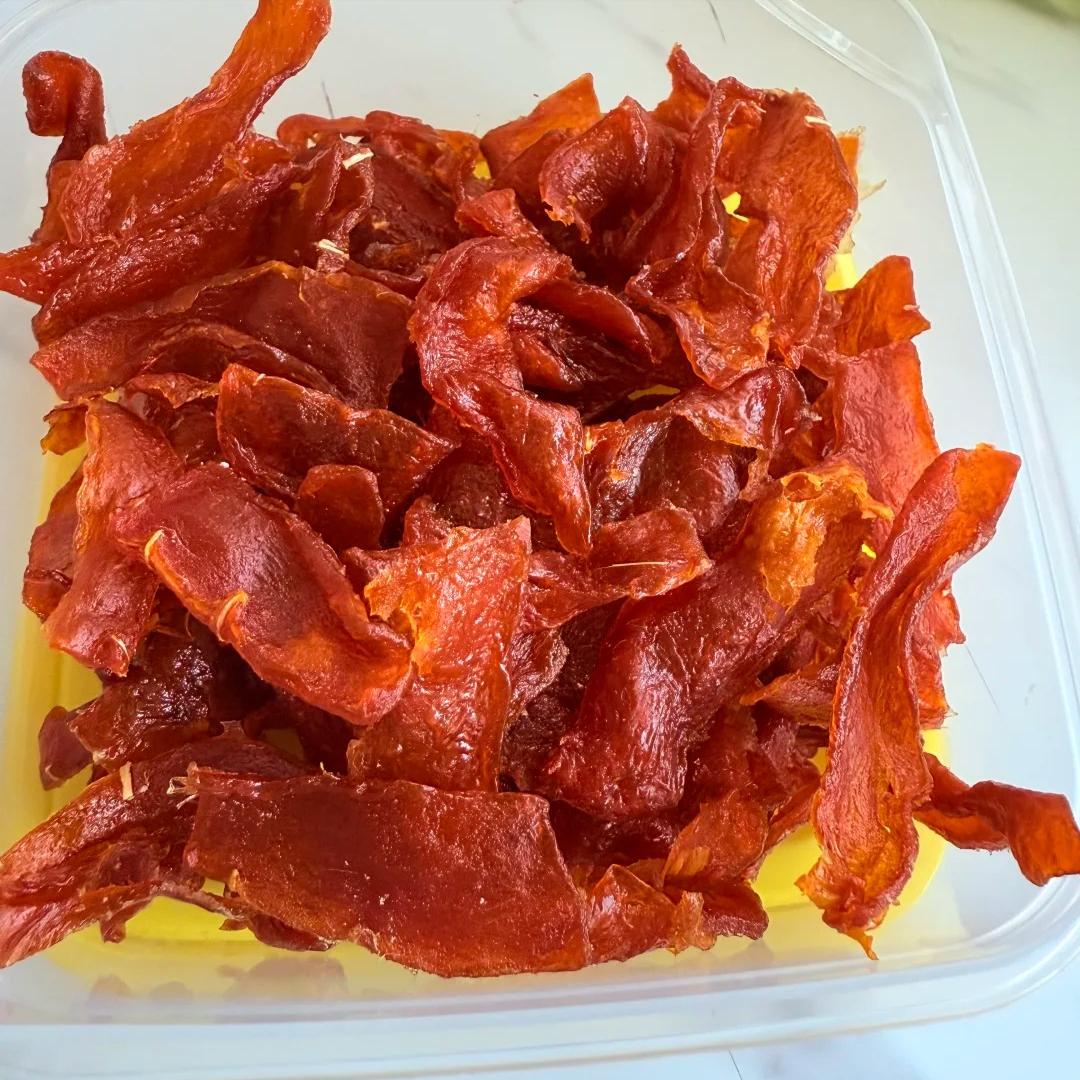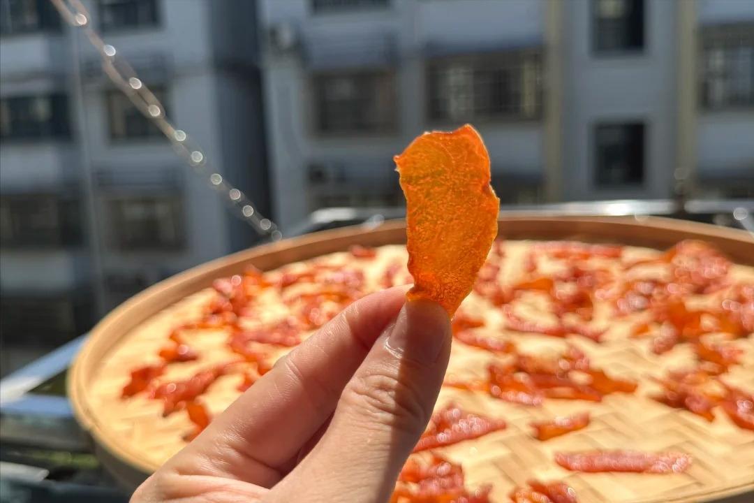 6、把蒸好的南瓜片拿出来,再放到太阳下面去晒。这时候的南瓜片经过蒸煮,变得更软乎了,再晒一晒,水分进一步蒸发。等完全晒干之后,你就会发现,这些南瓜干变得晶莹剔透的,就像琥珀一样。拿一片放到嘴里,嚼一嚼,又香又甜,还有糯米粉的那种软糯劲儿,追剧的时候吃上这么几片,那感觉,简直太爽了。