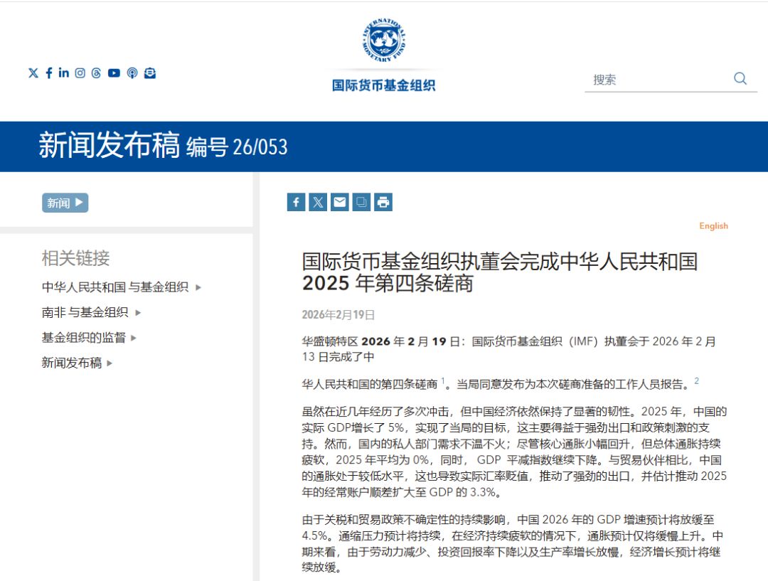 国际货币基金组织(IMF)执董会于2026年2月13日完成了中华人民共和国的第四条磋商。IMF报告指出,虽然在近几年经历了多次冲击,但中国经济依然保持了显著的韧性。2025年,中国的实际GDP增长了5%,实现了当局的目标,这主要得益于强劲出口和政策刺激的支持。