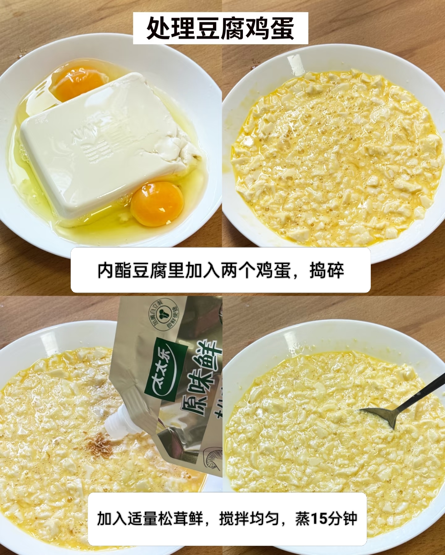 制作的第一步,是一次充满趣味的“解构”过程。将内酯豆腐完整地倒入一个大碗中,不需要任何繁复的刀工,只需让它保持着那种自然的柔嫩状态。紧接着,拿出两颗鸡蛋,轻轻磕破碗沿,蛋液滑落,与洁白的豆腐相遇。这时候,不需要小心翼翼,而是拿起筷子或勺子,开始一场欢快的搅拌。随着搅拌的动作,原本完整的豆腐块逐渐被捣碎,与金黄的蛋液充分融合,最终呈现出一种黄白相间、半流动的糊状质地。这种看似粗糙的混合,却是后续口感丰盈的关键。在这个过程中,加入少许松茸鲜调味,它能极好地提鲜,却不掩盖食材本味,为这道羹汤打下了一个鲜美的底色。