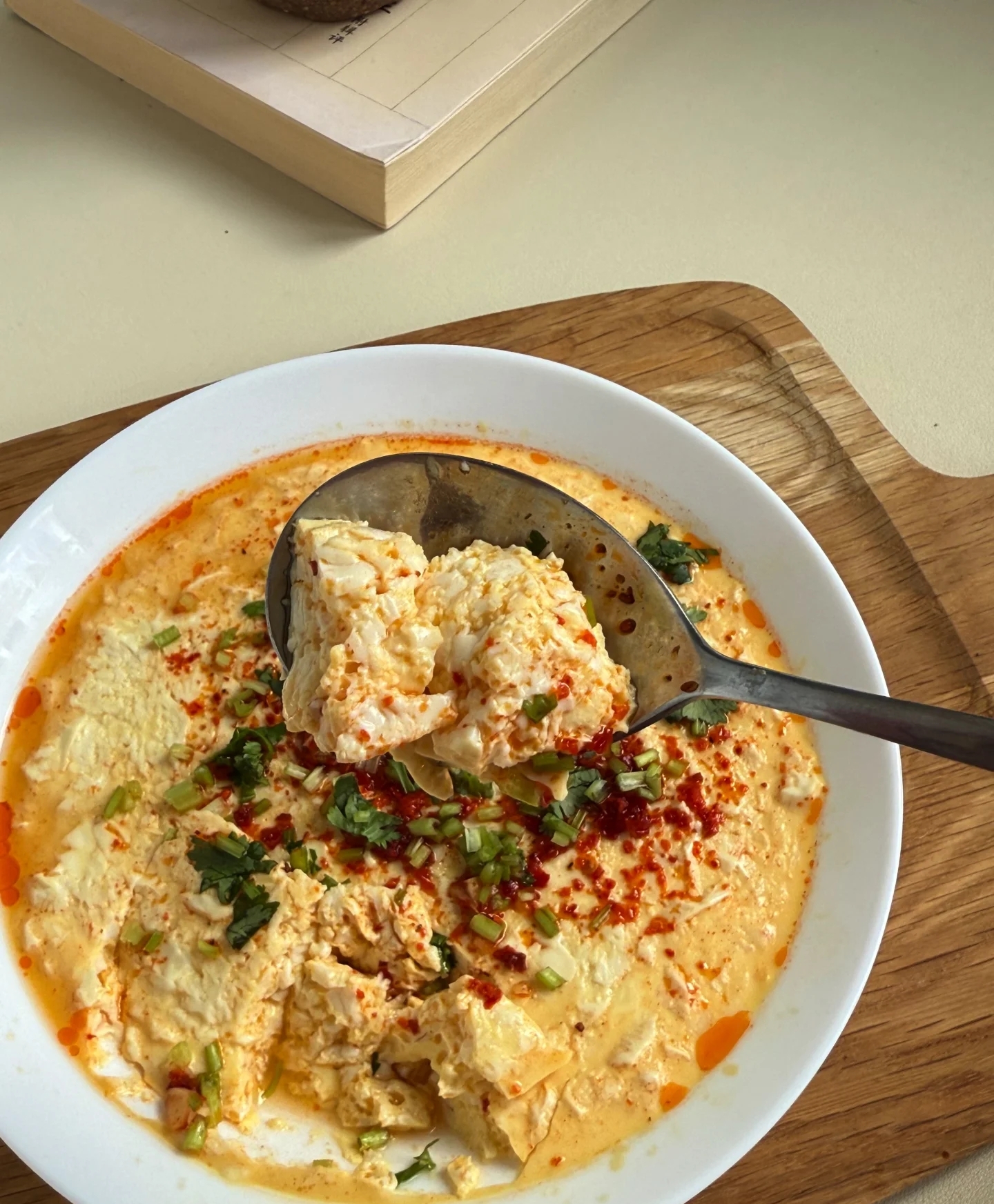 15分钟一到,关火,揭开蒸锅盖,一股热腾腾的白雾散去,露出碗中凝固得恰到好处的鸡蛋豆腐羹。此时的它,表面光滑如镜,内部组织紧致而嫩滑,像是一个刚出炉的黄金布丁。最后一步,便是将调好的灵魂料汁均匀地浇淋在热气腾腾的豆腐羹上。红油顺着金黄的表面缓缓流下,渗入到豆腐羹的缝隙中,香菜的翠绿点缀其间,视觉上瞬间拥有了极高的层次感。用勺子挖下一大块,送入口中,豆腐的嫩滑与鸡蛋的软糯在舌尖交织,外层裹挟着酸辣微咸的料汁,瞬间点燃了味蕾。那种口感,既有蛋羹的蓬松,又有豆腐的爽滑,酸辣开胃,让人一口接一口,根本停不下来。
