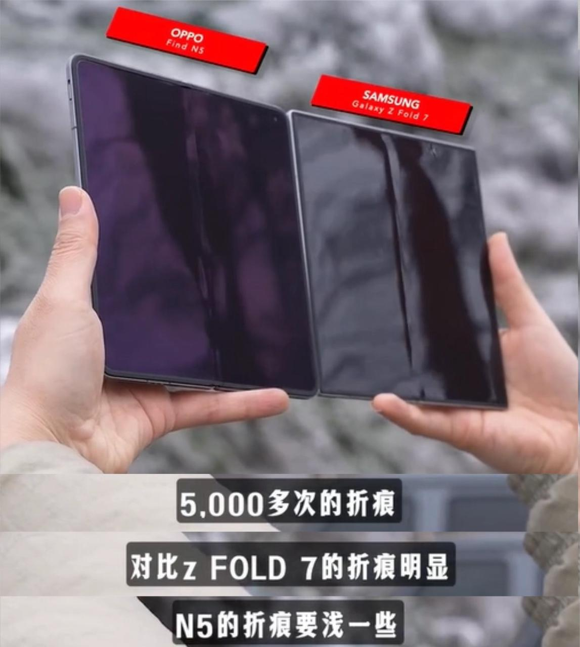 当然了,能被苹果认可OPPO也是有点黑科技在的。像知名博主“阿正很硬”最近就把OPPO Find N5拿到了冰天雪地,连续暴力折叠5000次,在极寒+机械的“地狱考验”下,折痕控制比三星 Z Fold7要浅上不少,这实力怪不得连苹果都想“抄”。