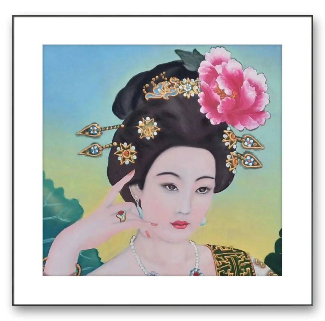 仕女画则展现了李因福先生细腻的笔触与高雅的审美。他笔下的仕女,延续了传统工笔仕女的典雅端庄,又融入了现代审美的清新灵动,摆脱了传统仕女的柔媚刻板,多了几分质朴自然的气质。线条流畅细腻,精准勾勒出仕女的体态风姿,衣袂飘飘,身姿窈窕;面部刻画入微,眉眼神情栩栩如生,或温婉浅笑,或凝神沉思,仿佛能从中读出人物的内心世界。色彩运用清丽淡雅,服饰色彩鲜艳却不浮夸,与背景的朦胧色调相互映衬,既符合仕女的气质,又展现出传统国画的韵味,尽显东方女性的柔美与温婉。