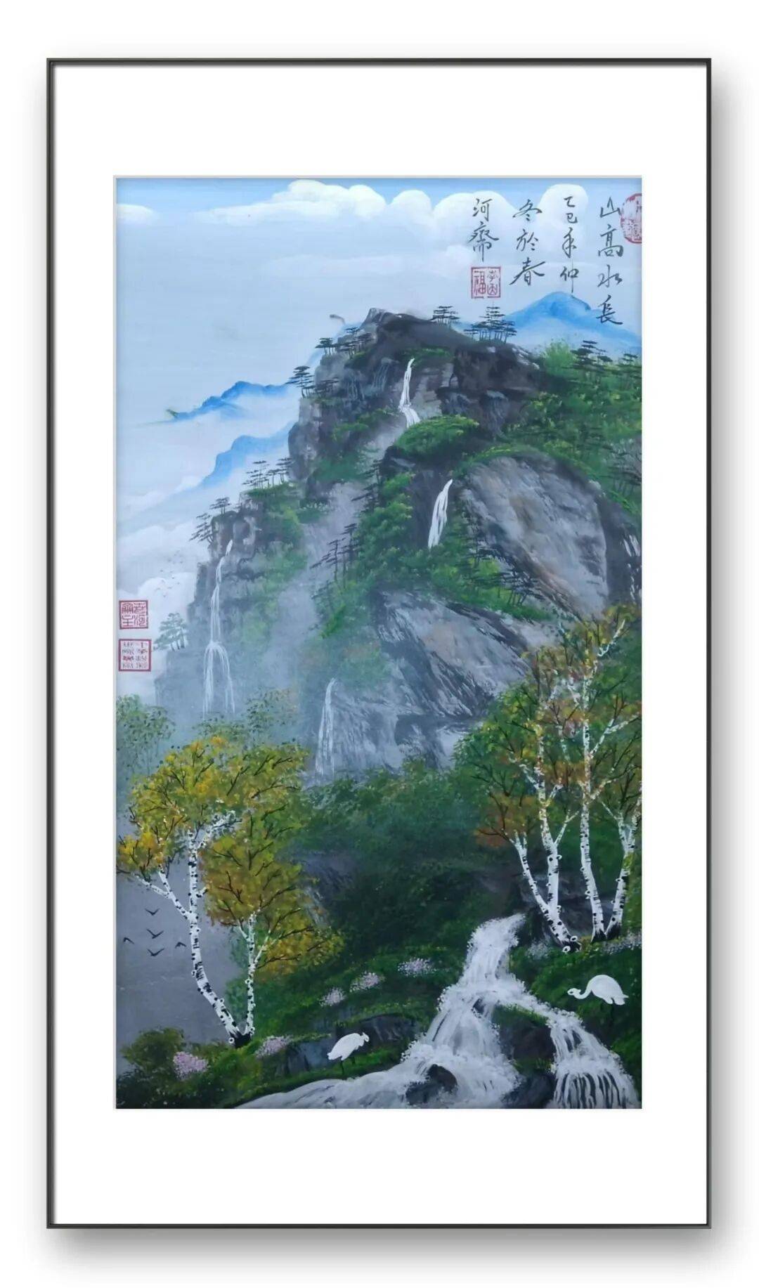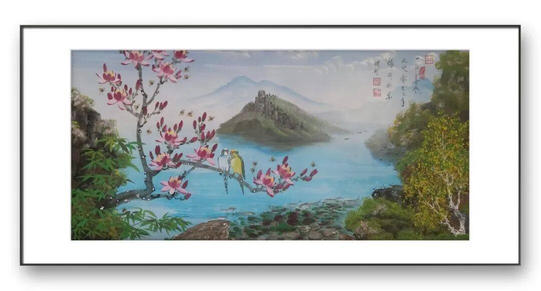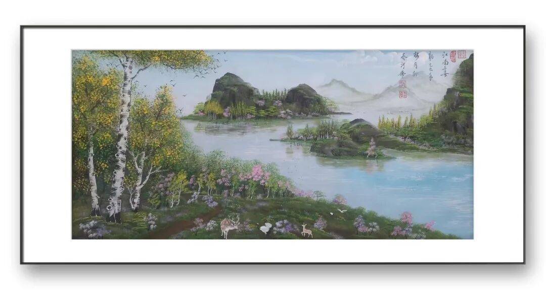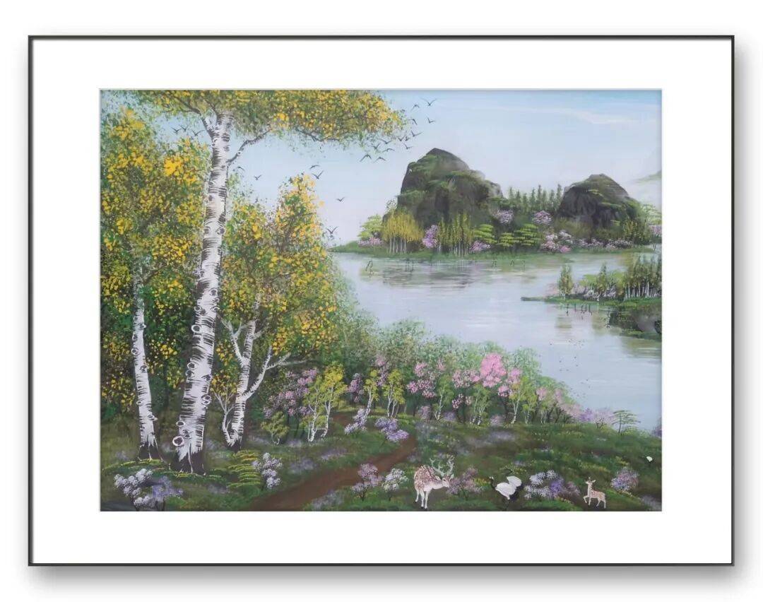 除了独创的砂纸粉彩画,李因福先生在传统书画领域的造诣同样令人惊叹。他涉猎广泛,国画、油画、烫画、玻璃画皆有涉猎,尤其擅长山水长卷、仕女、花鸟,每一种题材都能展现出独特的艺术魅力,彰显出他深厚的艺术功底与多元的创作能力。山水长卷是李因福先生的拿手好戏,他的长卷作品,构图恢弘大气,笔墨流畅洒脱,兼具气势与韵味。创作中,他注重整体布局的疏密有致,将山峦、溪流、屋舍、林木等元素有机融合,既展现出自然山水的磅礴气势,又蕴含着细腻的人文情怀。