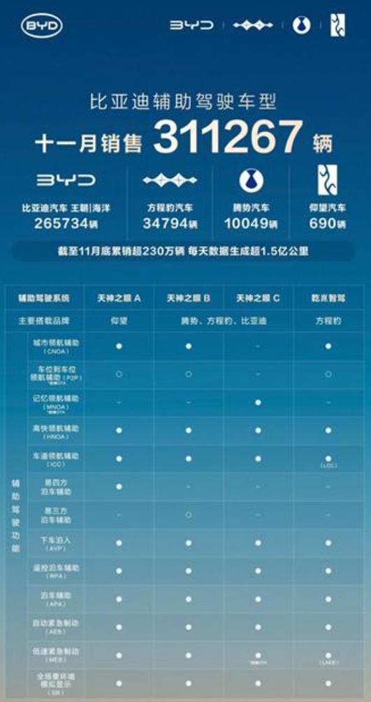 近日,比亚迪公布了其搭载天神之眼辅助驾驶系统的车型在11月的销售数据,全月销量达311267辆,继续引领市场。其中,比亚迪王朝与海洋系列贡献265734辆,方程豹、腾势、仰望等高端及个性化品牌亦表现稳健,共同构筑了比亚迪在智能驾驶领域的强大产品矩阵。
