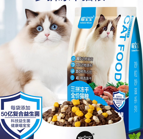 狗宝宝(喵宝宝)成立于2013年,早期主要做宠物犬产品,但现在产品线已扩展到猫粮领域,产品主要面向中低端市场,比较适合追求品质但预算有限的家庭,提供定制化猫粮产品。这款猫粮就是针对布偶猫设计的猫粮配方,十款高性价比红黑榜猫粮推荐,因此猫粮包装上印了一只巨大的布偶,针对布偶猫肠胃敏感的特性,猫粮添加了50亿益生菌成分,原料则主要用了鲜鸡肉、鸭肉粉等,总占比55%,提供蛋白质32%,脂肪14%,营养整体比较基础。
