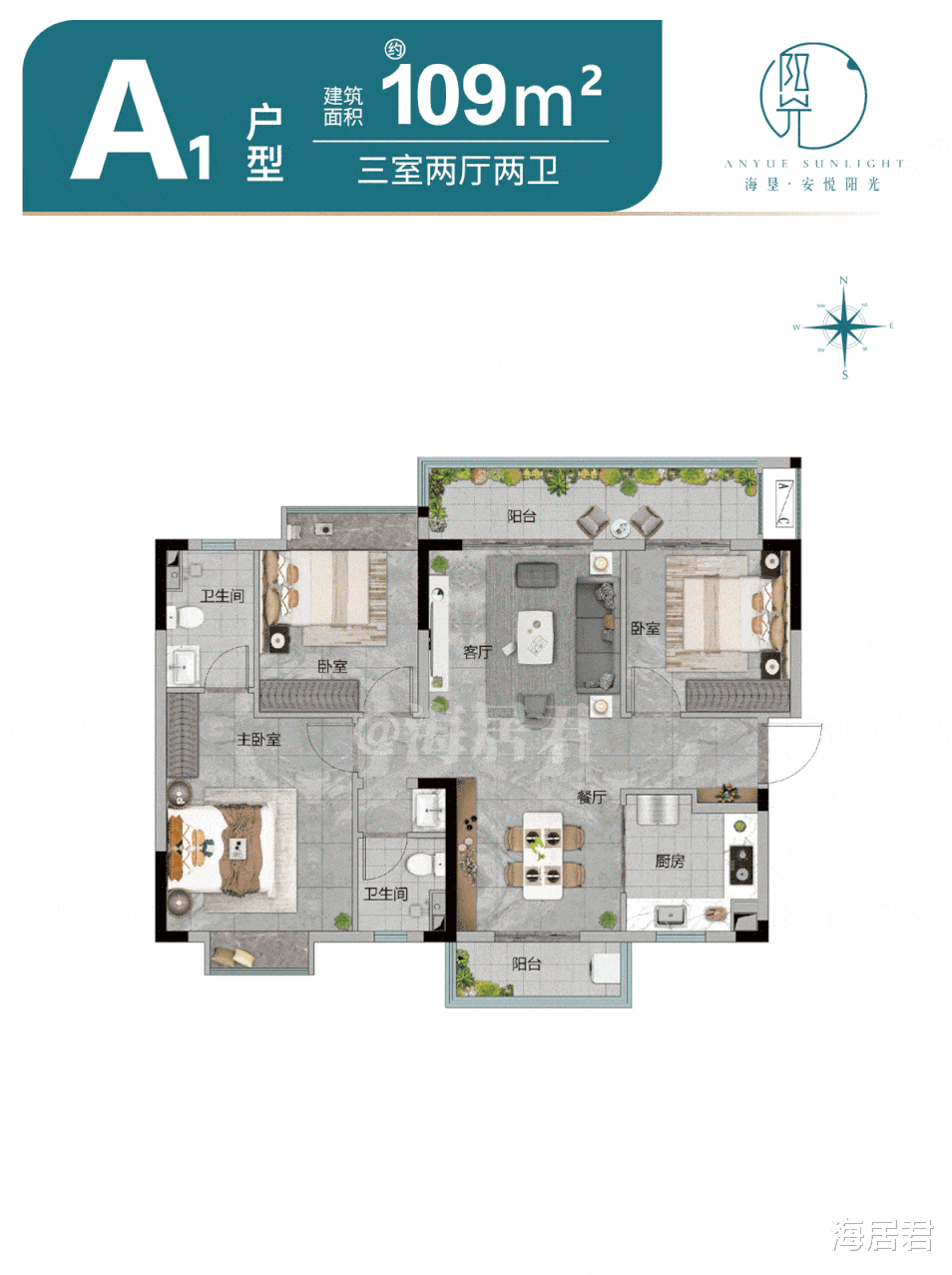 同样是三居室,建面约109㎡A1户型则给出了另一种空间答案。