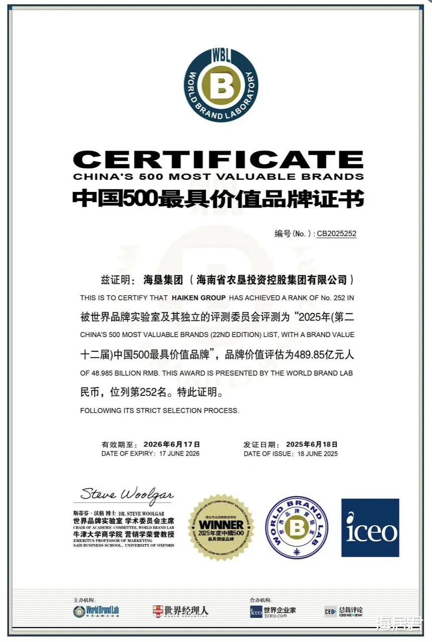 今年的世界品牌大会上,海垦集团更以不俗实力荣登《中国500最具价值品牌》榜单第252位,品牌价值高达489.85亿元,堪称海南的一张“金名片”。