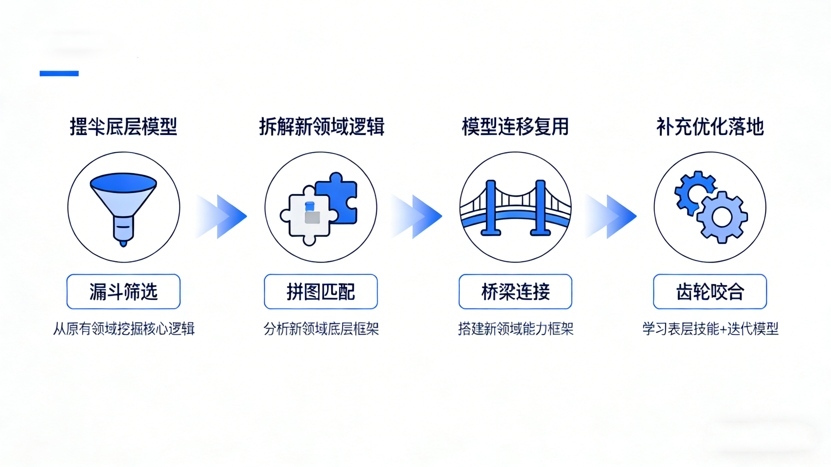 第三步:模型迁移复用,搭建新领域能力框架(快速上手)这是跨界的核心步骤:把原有领域的底层模型,迁移到新领域的匹配环节,快速搭建新领域的能力框架,不用从零开始学。