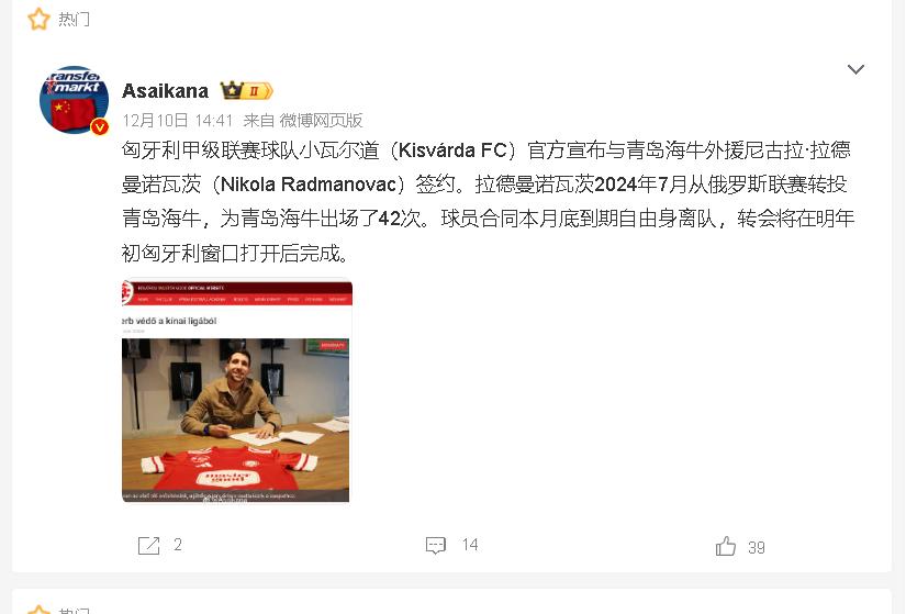 当匈牙利甲级联赛球队小瓦尔道官宣签下青岛海牛外援尼古拉·拉德曼诺瓦茨时,中国球迷的神经再次被刺痛,为什么这样说?这位2024年7月才从俄罗斯联赛转投中超的外援,仅效力1年半便以自由身离队,转投欧洲次级联赛。42次出场的数据背后,是中超外援政策失效的缩影,更是中国足球人才流失的冰山一角,真是如此吗?