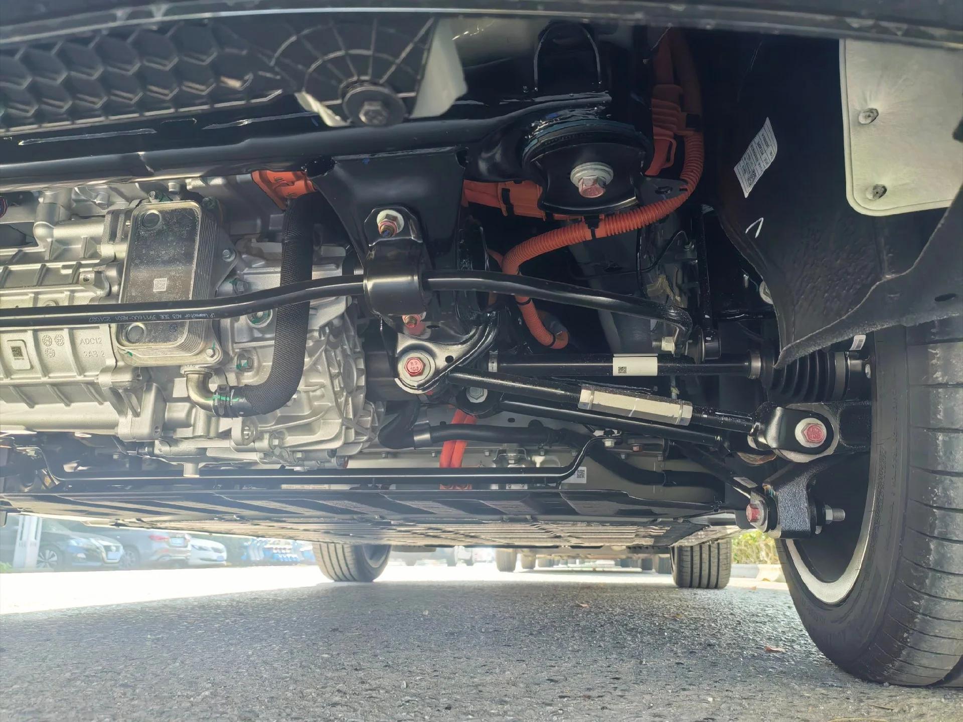 驾驶体验感受上,首先是坐在车内后座椅的坐姿更趋于像是一台SUV的坐姿感受,而该车的底盘采用的前麦弗逊式独立悬挂以及后多连杆式独立悬挂,整体调教更趋于操控表现,由于我是在城区道路试驾,并没有过于激烈测试这款车。而在过弯时,该车还是有着不错的后驱车该有的感受,稍微加速过弯的情况下,该车的底盘横向支撑表现还不错,但坐在车内的还是能够感受到一定的侧倾,而在经过城区道路的减速带时,该车的底盘的零碎颠簸感还是能够感受到,底盘的整体感上还是有一定的提升,但是话又说回来,10万级的车型能够给到这样的表现,还“要啥自行车”啊。还有一点就是我在车后底部拍到的,整体的线路设计还是稍显凌乱,真要买这台车还得考虑在底部装上一个护甲。