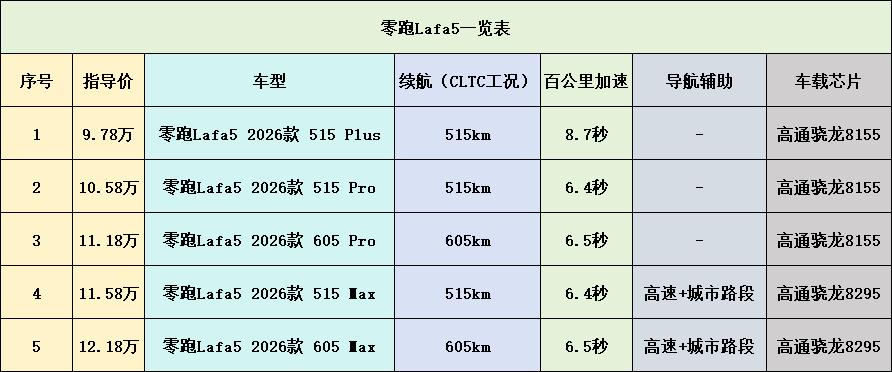 为了能够更为直观的对比零跑Lafa5各个配置车型版本,我制作的了一个一览表以供大家参考。