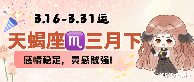 分析:三月下旬,天蝎们和另一半会有较多沟通交流,相处还算愉快。不过其实你们双方都有一些小秘密遮掩着没告诉对方,给你们的感情留下一些神秘感。整体来讲,相处还算是愉快,可以期待一下。