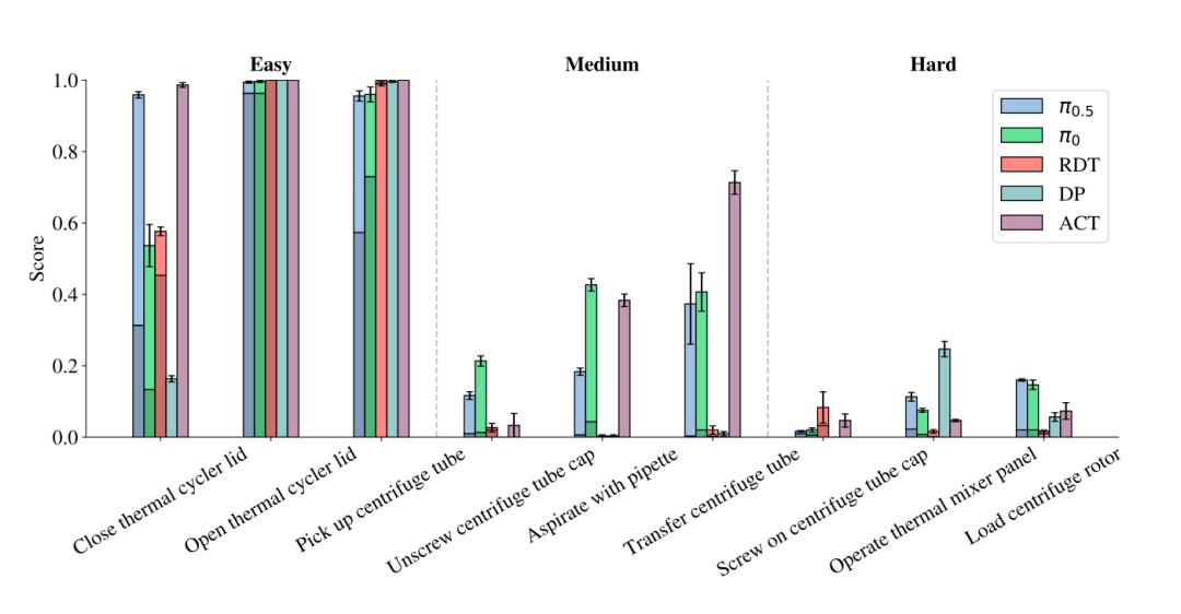 简单任务:单步或低精度操作,如打开或关闭仪器盖; 中等任务:需要一定精度和语言理解能力,如拧开离心管、样本转移; 困难任务:涉及多模态推理,如读取屏幕参数并精确调节实验设备。