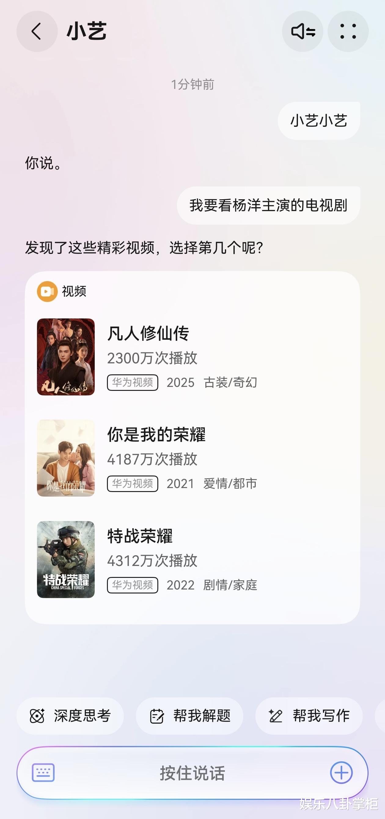 我可真是运气爆棚!竟然领到了优酷会员月卡,正好可以畅追《凡人修仙传》。最近对“杨洋”很上头,趁着这几天停更,想追他主演的其他电视剧缓解我等更新的着急,但不了解他演了啥剧。想起华为视频的【AI影视全能搜】,我对着手机喊:“小艺小艺,我要看杨洋主演的电视剧。” 立即给我推荐了视频播放卡片,点击自己想看的可直接跳转到华为视频看,这功能可太懂咱剧迷的心了,简直是追剧神器!
