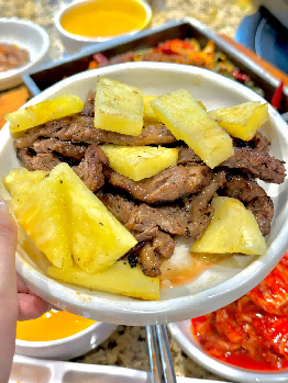 一定要点菠萝烤牛肉,肉质巨嫩,牛肉夹着着菠萝,感觉烤完还有水果的香气无法形容的好吃! 还有他们家金灿灿的烤芝士条剪成小块淋上甜甜的炼乳,糯叽叽的~