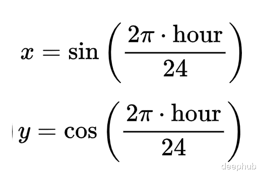 2 * π * hour / 24:先把小时数值转化成弧度角度。在这个体系下,午夜和晚上 11 点的角度非常接近,通过 sin 和 cos 将角度投影到两个坐标轴上。