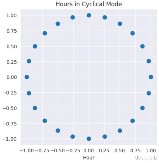 plt.figure(figsize=(5, 5))plt.scatter(df['hour_sin'], df['hour_cos'], linewidth=3)plt.title('Hours in Cyclical Mode')plt.xlabel('Hour')