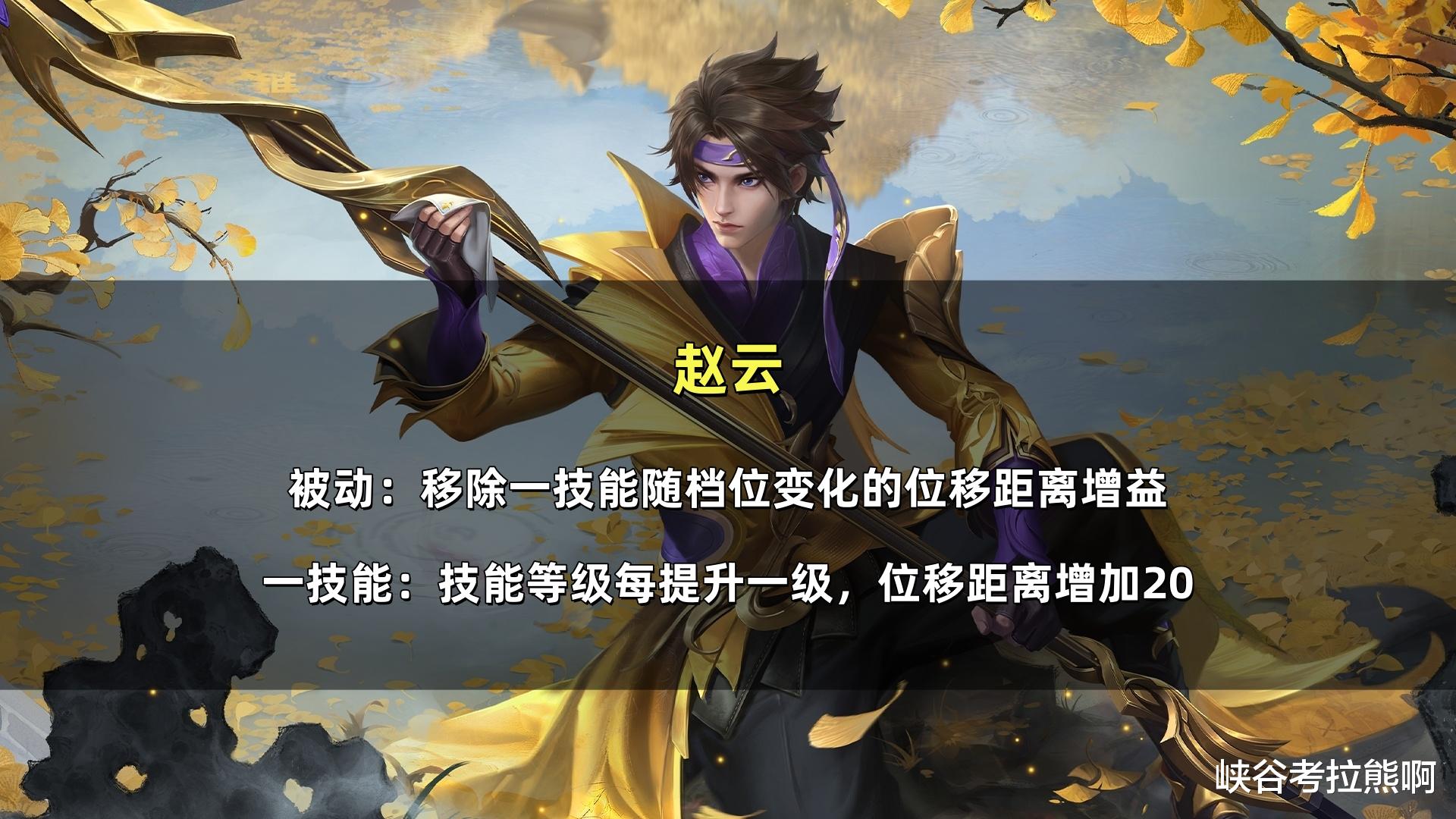 赵云(加强):本次移除一技能随档位变化的移位距离增益,新增了一技能每提升一级,位移距离增加20码