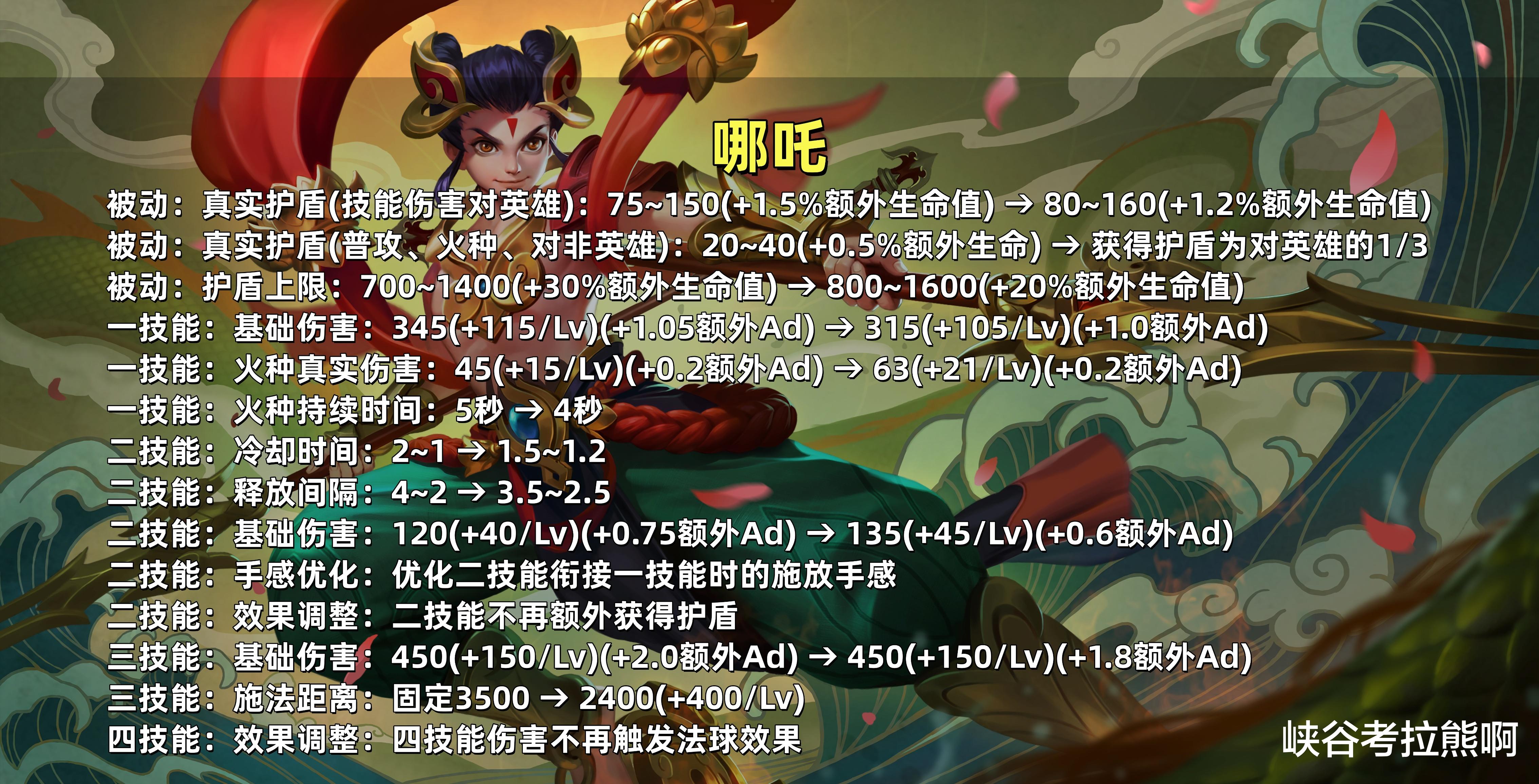 (1)护盾值削弱:被动真伤护盾及上限值降低,二技能不再额外获得护盾效果。
