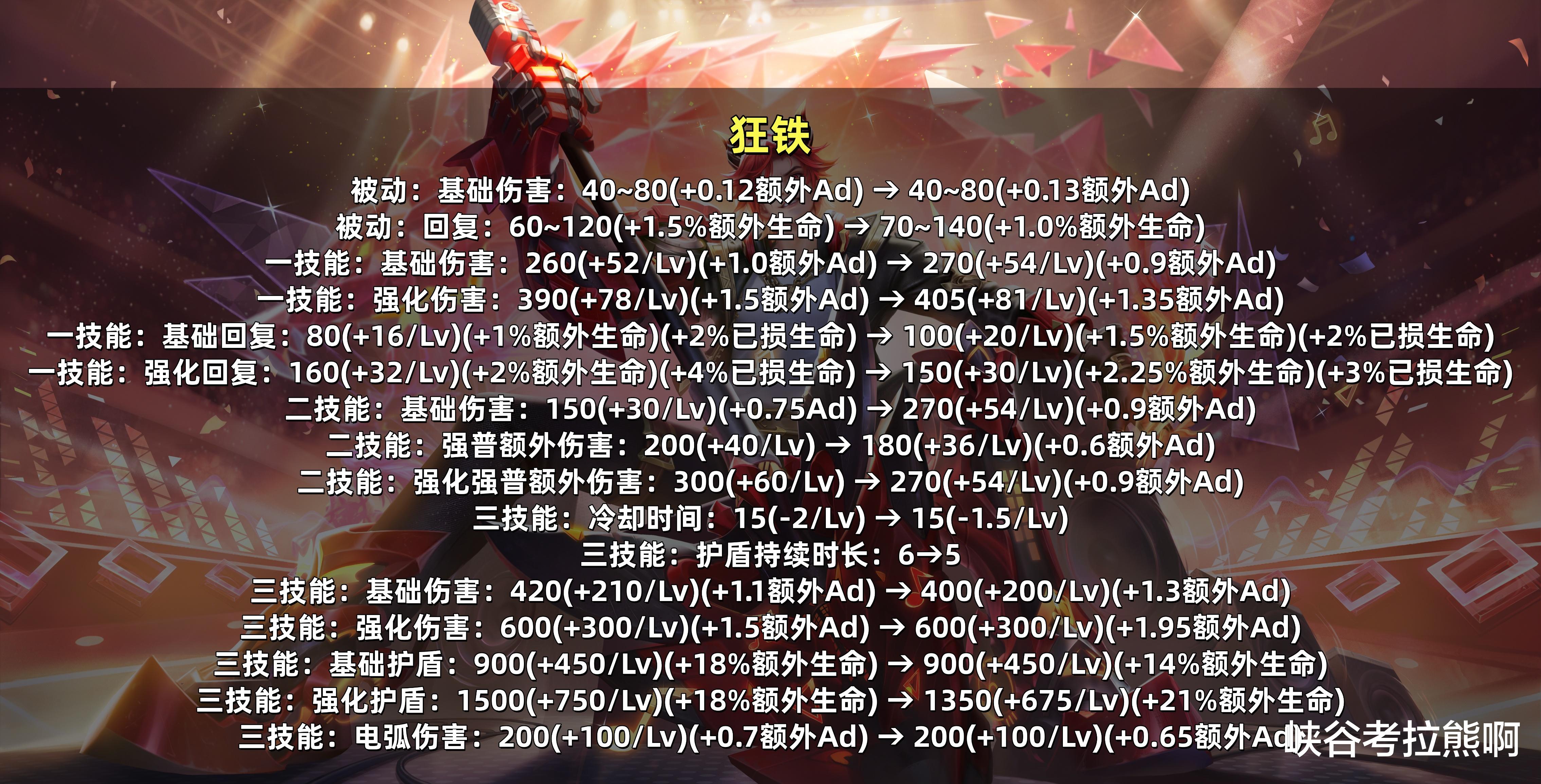 解读:15级后三个技能的总伤害量只提升了几百点,但护盾量和护盾持续时间全部降低,无能量状态回血能力提升,但有能量状态下回血能力下滑,半肉或纯肉狂铁大亏!