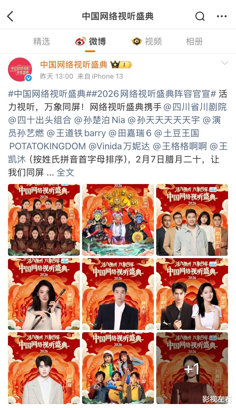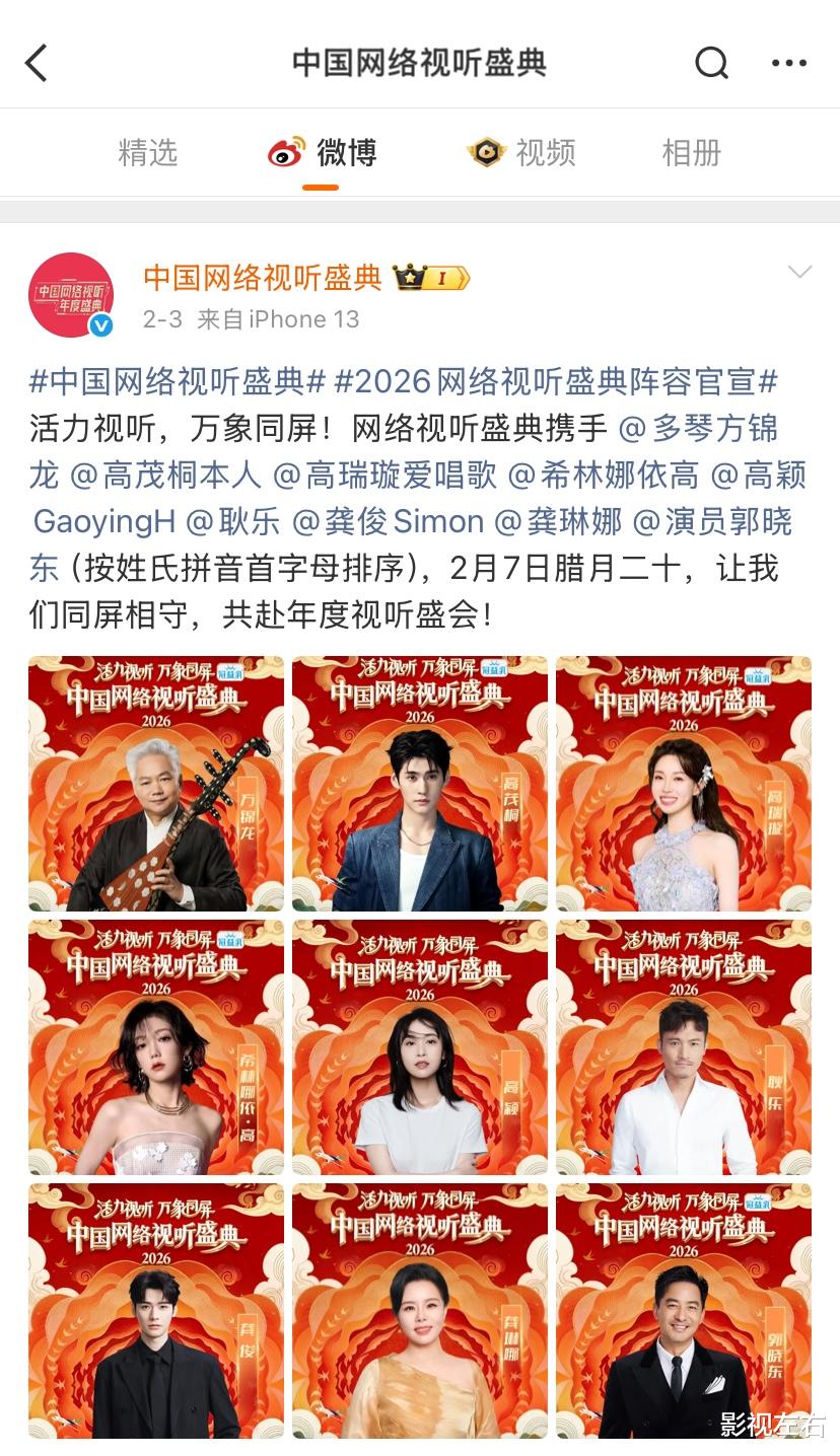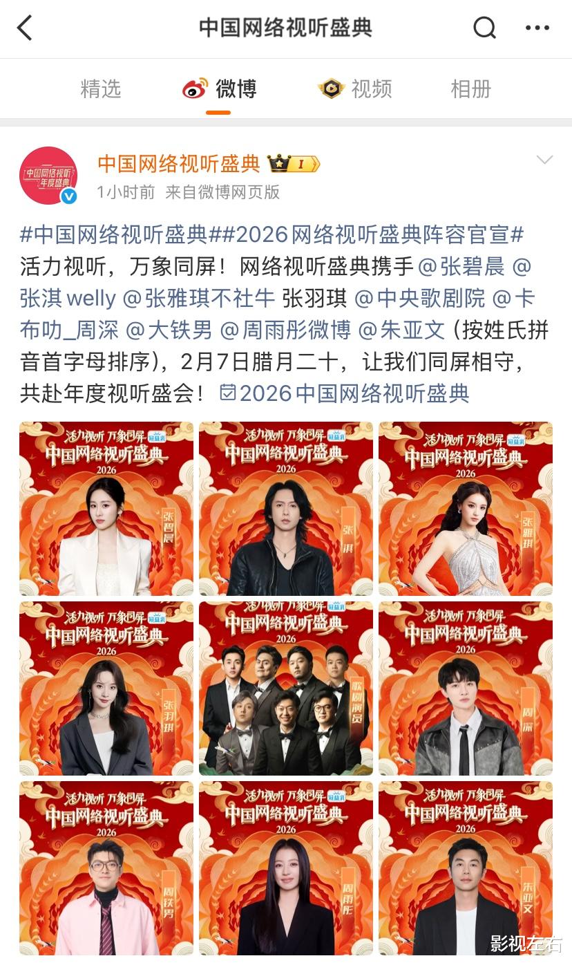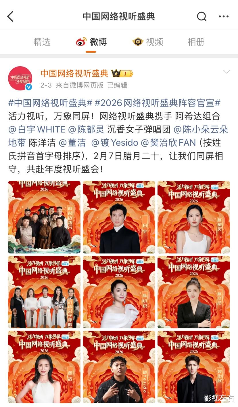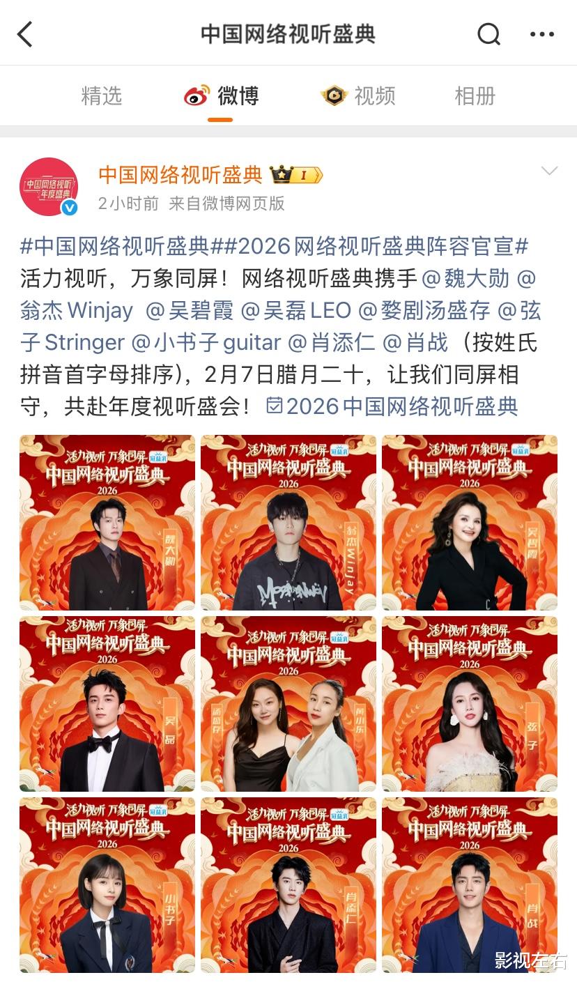 另外,从官宣信息可见,此次“2026中国网络视听盛典”嘉宾阵容依旧十分豪华,共有百余位艺人同台献艺。