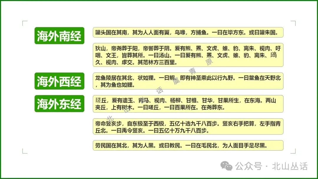 山海经里包含“一曰/或曰”的条目,除了大荒北经,还见于海外四经和海内四经。包含两处“一曰/或曰”的条目有六个,海外南经的讙(huān)头国和狄山、海外西经的龙鱼、海外东经的𨲠(jiē)丘、竖亥和劳民国。被人忽视的“或曰”!