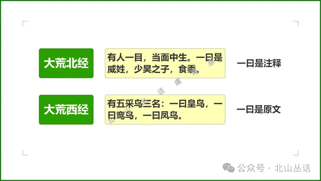 大荒经包含“一曰”的条目,大荒北经和大荒西经各有一个。大荒北经:“有人一目,当面中生。一曰是威姓,少昊之子,食黍。”大荒北经里的“一曰”是注释。大荒西经:“有五采鸟三名:一曰皇鸟,一曰鸾鸟,一曰凤鸟。” 大荒西经里的“一曰”是原文。