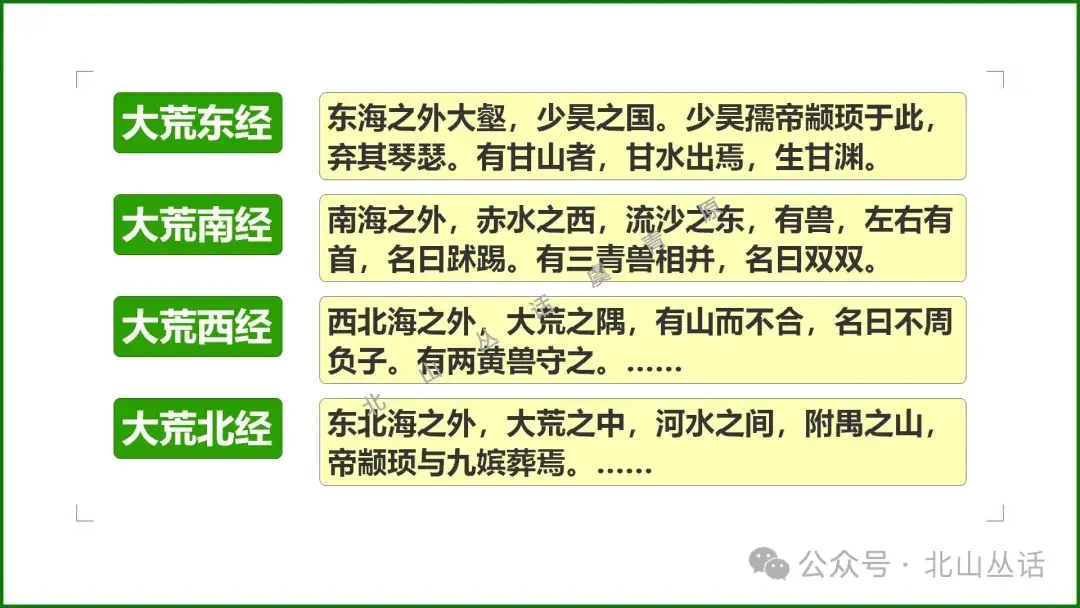 其实大荒经本来是一篇,刘歆将大荒东经设定为从“东海之外大壑”开始;在第一个“南海之外”处,分出了大荒南经;在第一个“西北海之外”处,分出了大荒西经;在“东北海之外”处,分出了大荒北经。