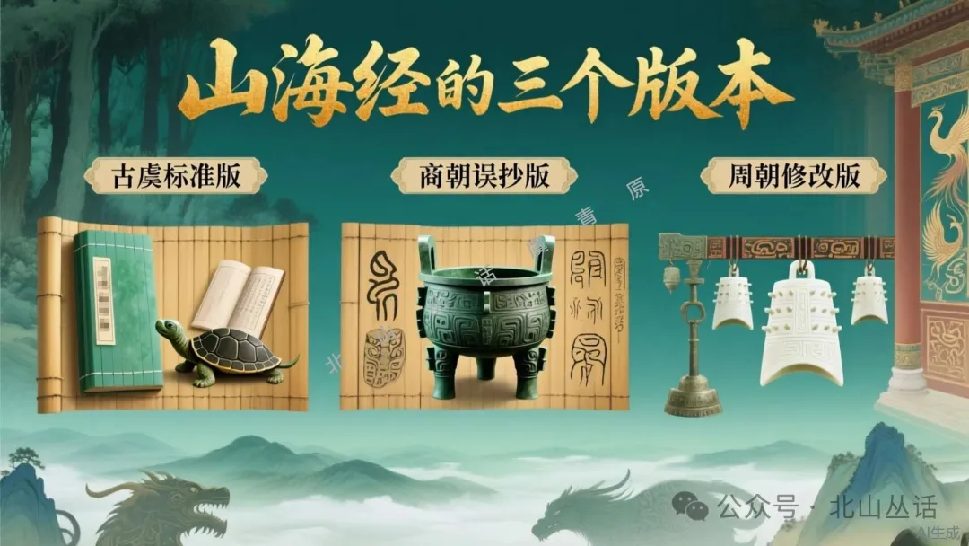 山海经流传至西汉时有三个版本。一个是古虞后人传下来的标准版,一个是商朝传下来的误抄版,一个是周朝传下来的修改版。