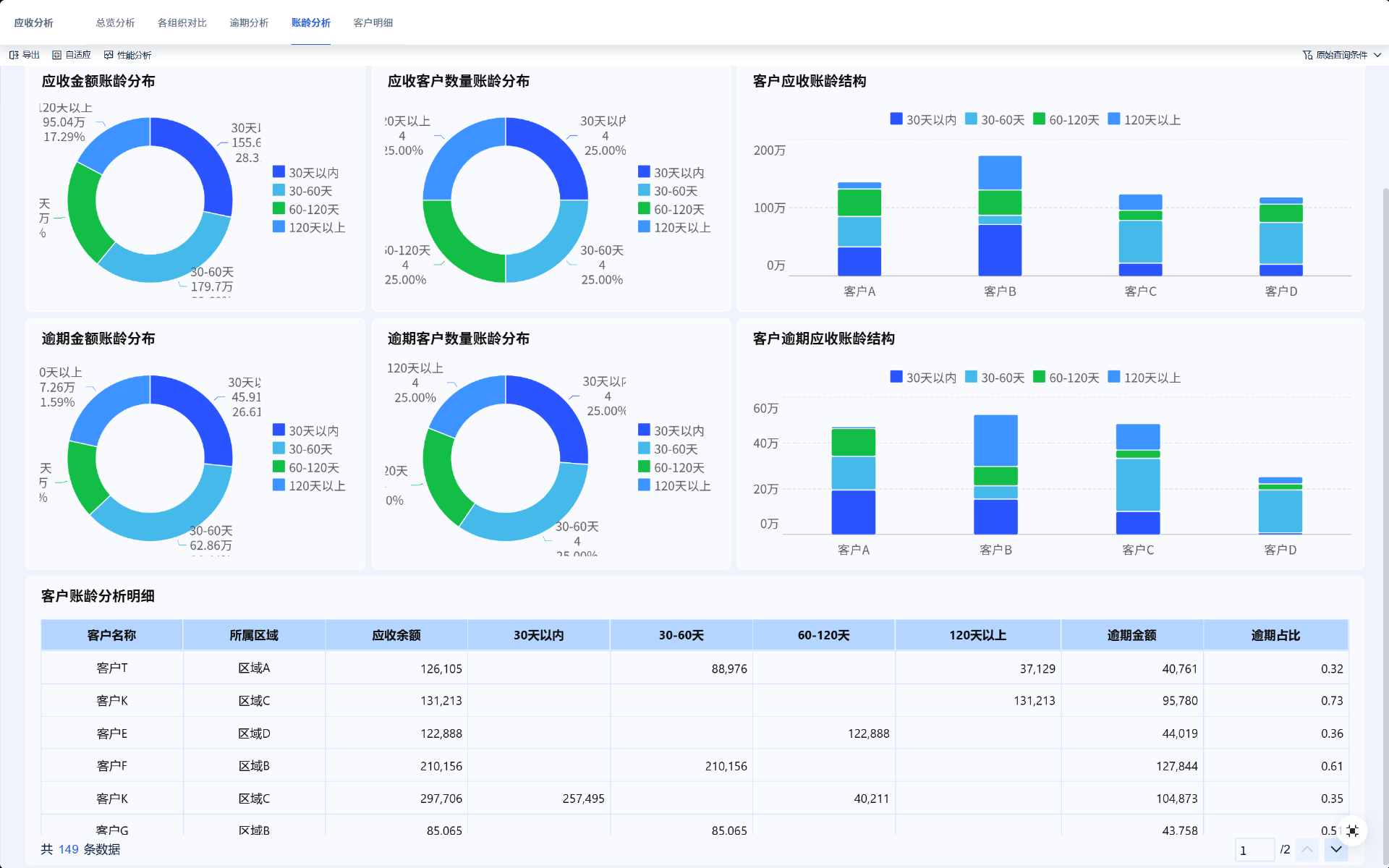 其实用之前提到的FineBI的话,能按客户、按区域自动拆分数据,就像下面这张看板,不用自己筛选分类,每天花 10 分钟就能看明白整体逾期情况。