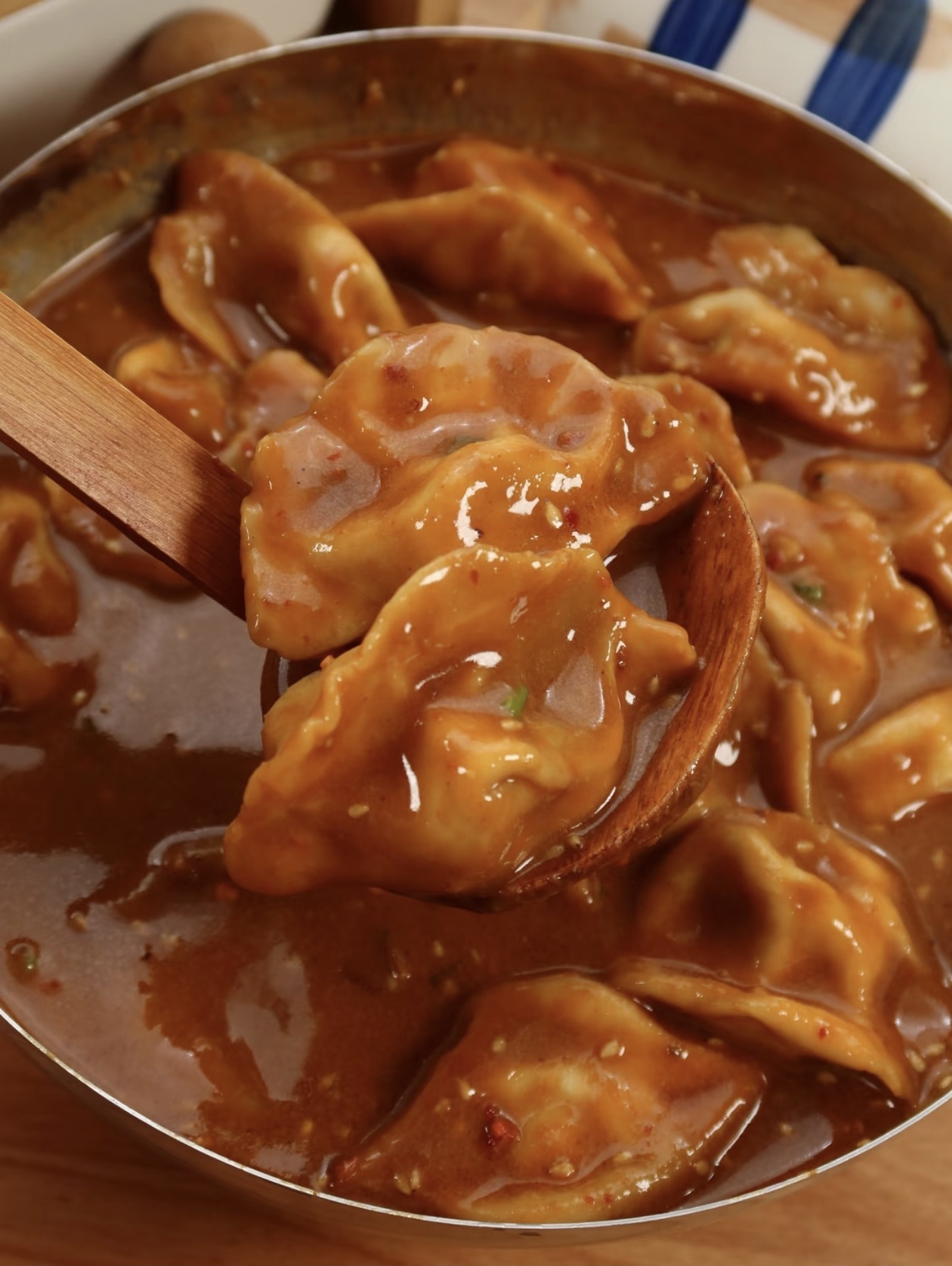 将煮好的饺子捞入调好的酸汤碗中,再舀入几勺滚烫的饺子汤,汤面微微没过饺子即可。喜欢口感更丰富的,可以烫几颗青菜、加一点紫菜或虾皮,红绿相间,鲜香加倍。用筷子轻轻拌匀,让每一只饺子都均匀裹上麻酱酸汤,棕红油亮的汤汁挂在饱满的饺子上,香气扑鼻,还未入口,便已让人垂涎。