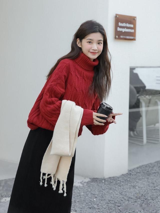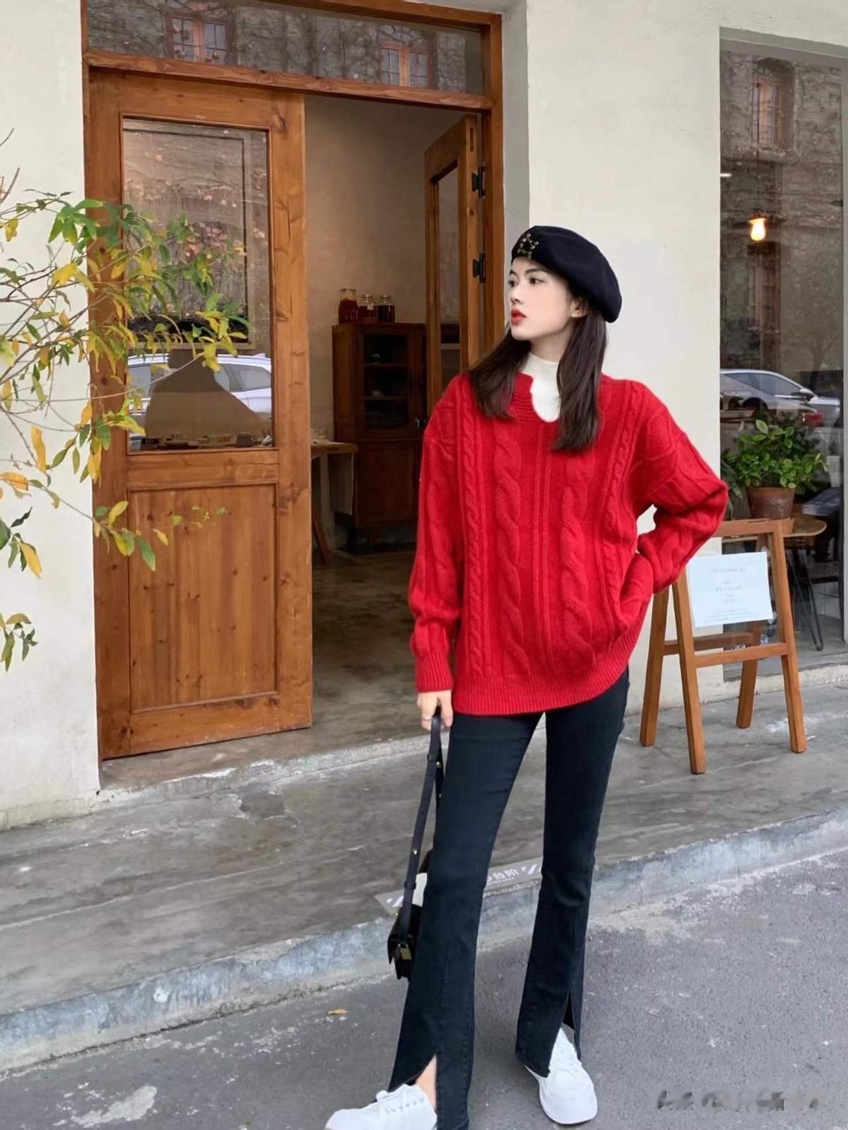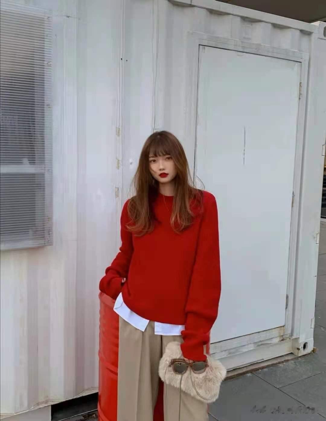 以近年流行的“奶奶衫”为例,这类毛衣多采用粗针织工艺,表面带有自然的纹理感。微胖身材选择时,可优先选择V领或小方领设计——领口的纵向延伸能在视觉上拉长颈部线条,同时弱化胸部的厚重感。搭配时,建议采用“上松下紧”的搭配法则:宽松红毛衣搭配高腰直筒裤或A字裙,既保留了红毛衣的节日氛围,又通过上下装的量感对比达到显瘦效果。