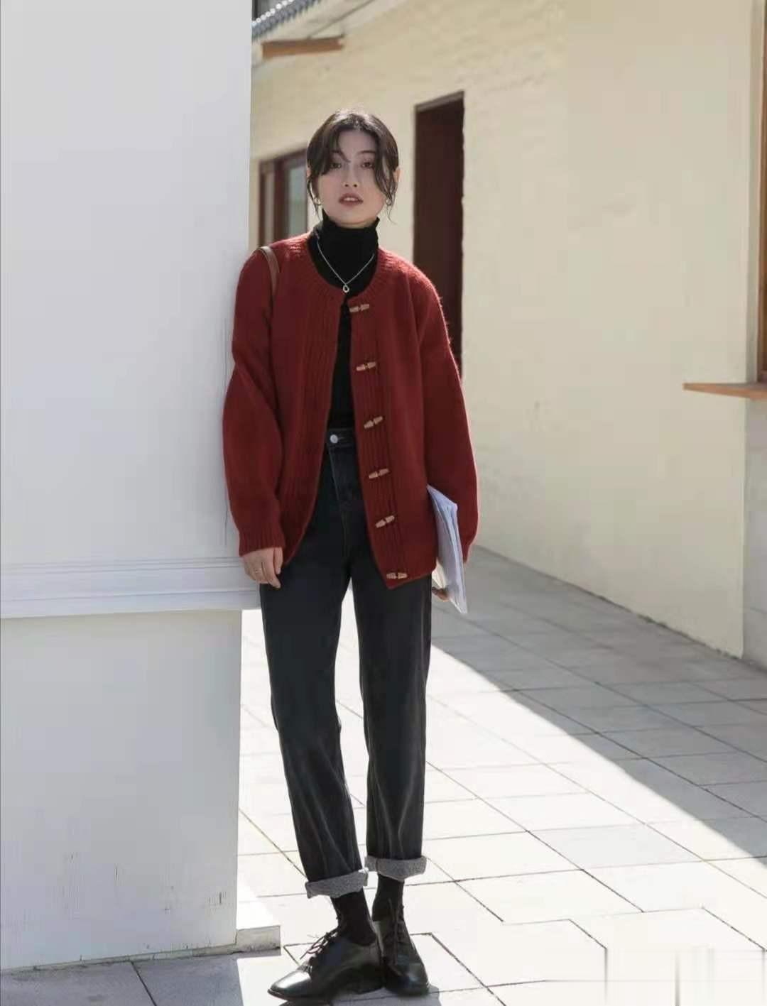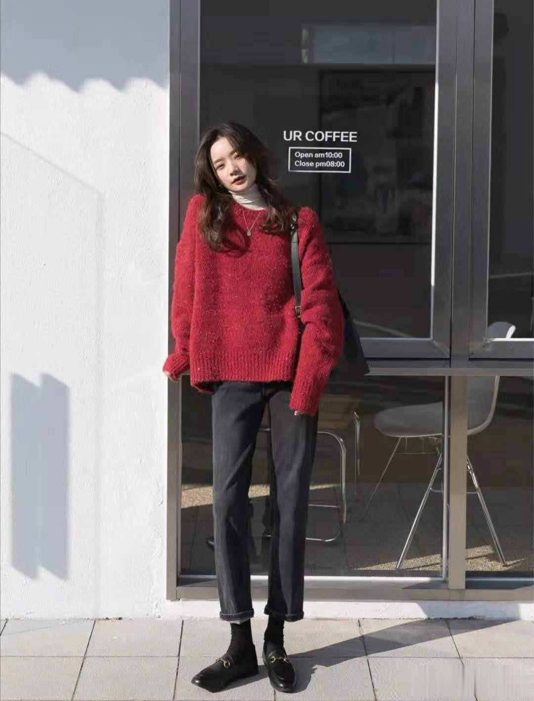 更进阶的搭配技巧在于“色彩分割”。小个子穿红毛衣时,可尝试“上红下黑”或“上红下灰”的配色方案。红色作为高饱和度色彩具有天然的视觉扩张感,而黑色或灰色则能通过收缩感平衡整体量感。这种“上扩下收”的配色逻辑,本质上是在视觉上制造“头轻脚重”的稳定感,让小个子在穿红毛衣时既保持了节日氛围,又避免了“头重脚轻”的失衡感。