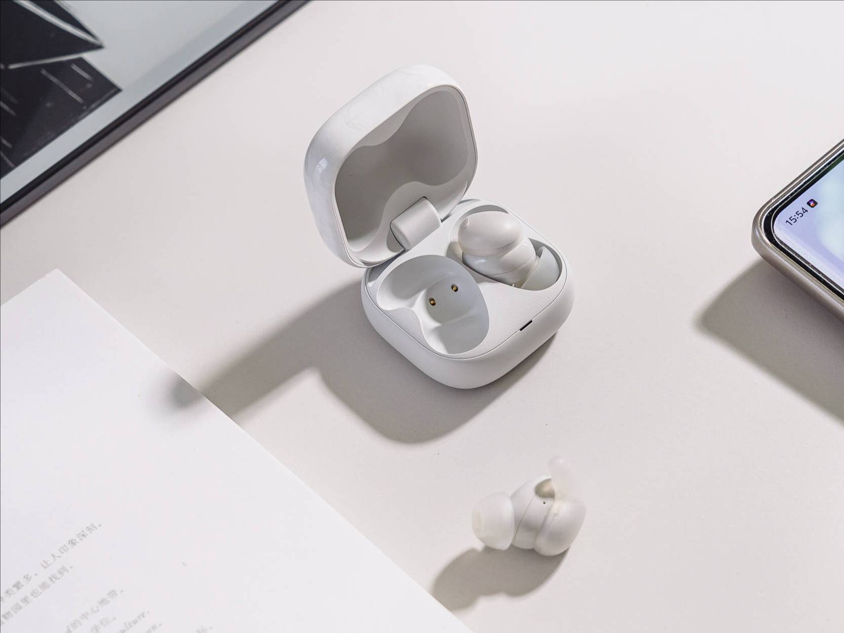 机型亮点:充电仓简洁大方,月光白配色触感细腻,开合顺滑有回馈感!