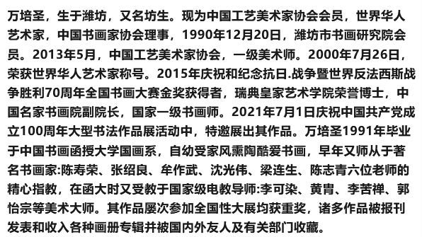 万培圣先生的书画艺术,最动人的不仅是精湛的笔墨技法,更是其作品背后深厚的家风底蕴与人文情怀。家风的滋养,让他始终保持着淡泊宁静的心境,不追求名利,不刻意张扬,只在笔墨的流转中享受艺术带来的宁静与快乐,在创作中坚守初心、传递美好。他认为,书画不仅是一门艺术,更是一种传承,一种修行,练习书画的过程,既是锤炼技法的过程,也是沉淀心性、陶冶情操的过程,更是传承家风、传递文化的过程。