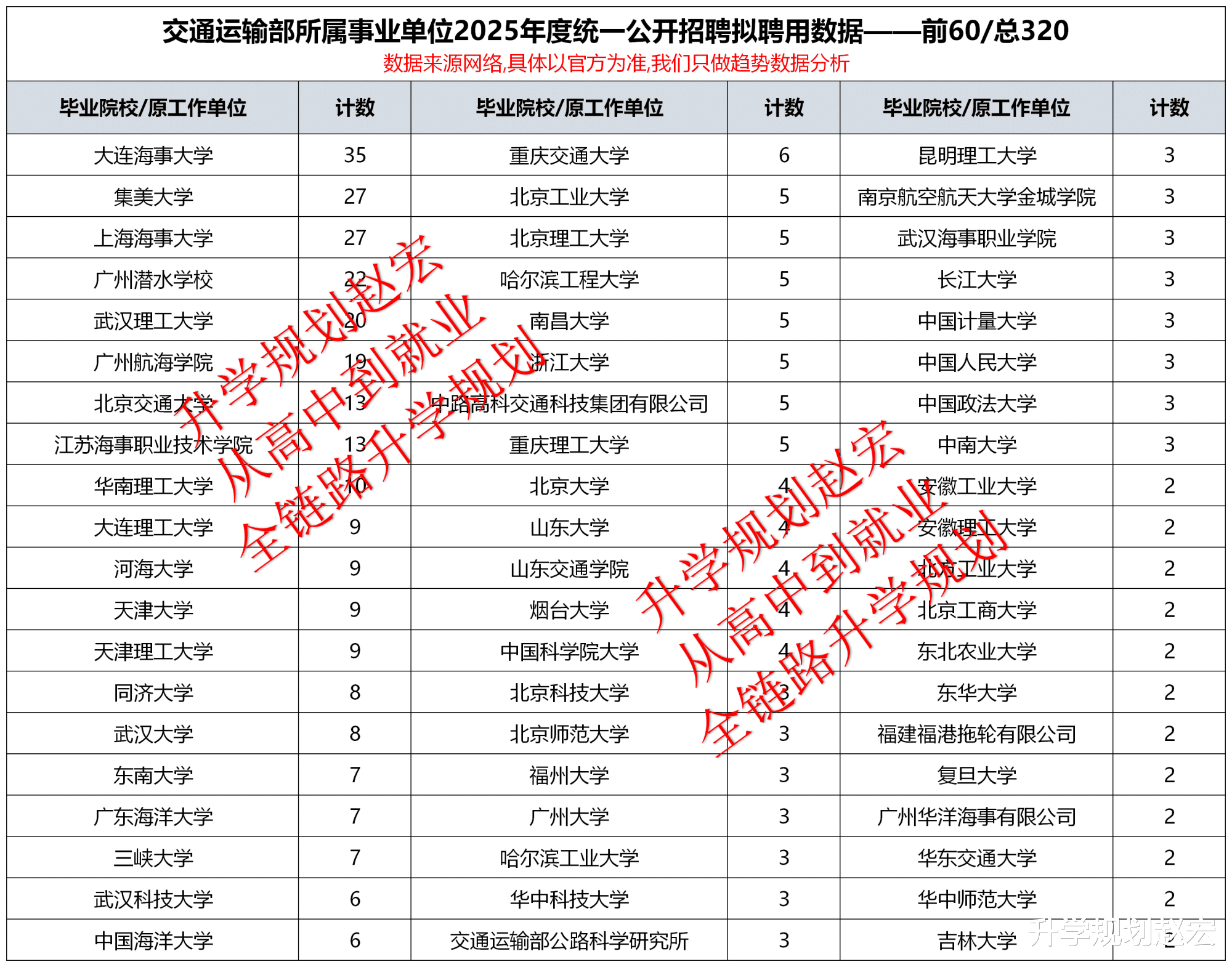 那本文咱们来看看交通运输部所属事业单位2025年度招录数据,除了这个招录外,国考等路径中也有,具体区分咱们就不说了,大家自行去了解。我们统计的数据总共有7个批次,总共697人,下属单位人数最多的是广州打捞局62人,然后是东海航海保障中心55人和南海航海保障中心52人,接下来是上海打捞局和天津水运工程科学研究院49人。从学历上来看,大学本科295人,硕士研究生277人,博士研究生77人,大学专科26人,中专22人。这些名单中,有多名同学是从工作单位考过来的。