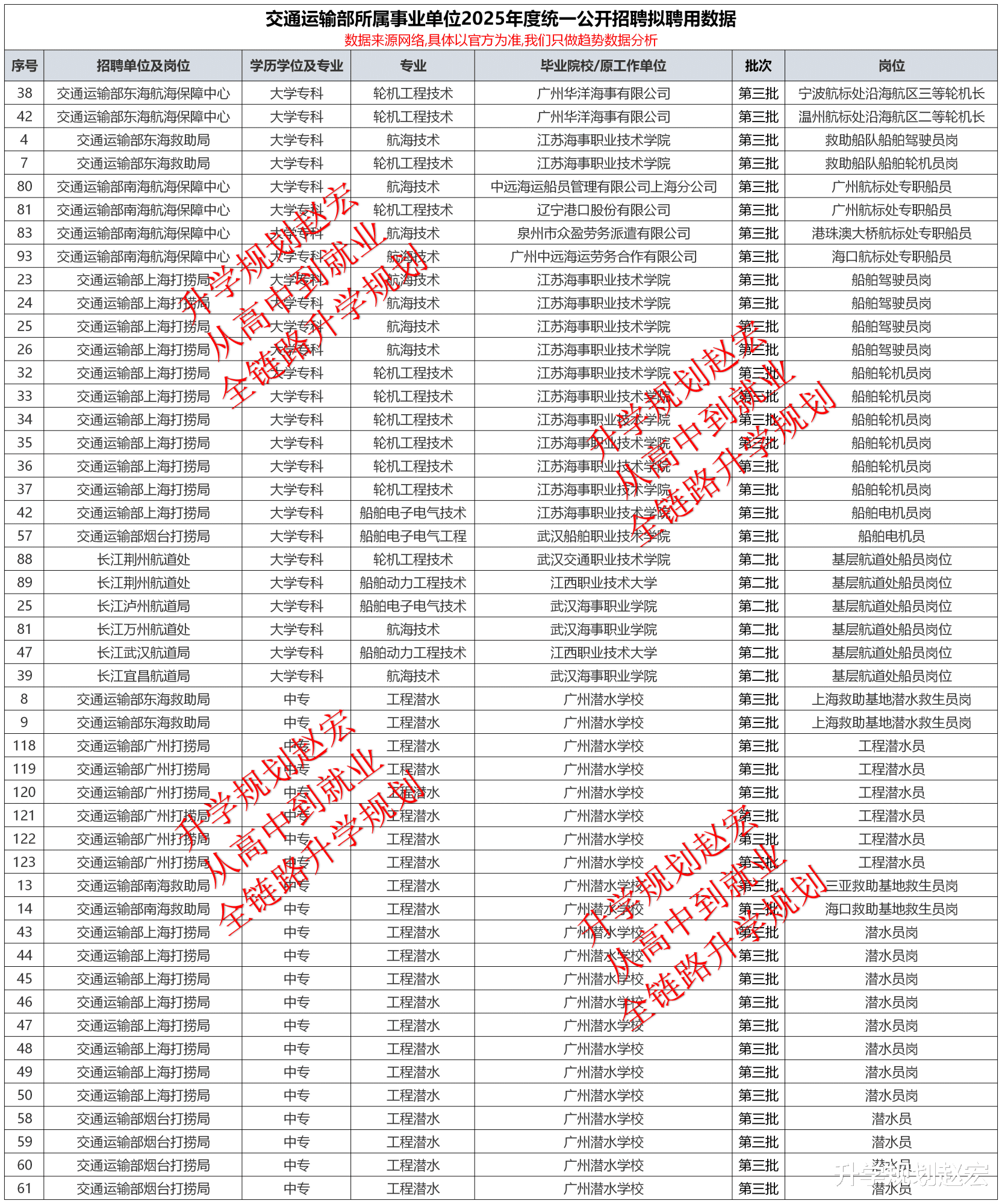 这儿把专科和中专的数据单列出来了,中专全部是广州潜水学校,岗位是潜水员,专业是工程潜水。专科的专业是轮机工程技术、航海技术和船舶电子电气技术,也就是大家说的航海类专业。院校主要是江苏海事职业技术学院、武汉海事职业学院,这个专科专业和院校,和其他行业也差不多,比如电力、铁路、气象等等,都是强相关院校。专科有优势,但是要选好院校和专业,并且都要匹配,每年都有很多同学吃亏,专业选了热门,但不是强相关,最后说我们选了这个学校,还是进不了这些单位,骗子。接下来咱们来看看具体的院校和专业数据,这个才是咱们要关注的重点。