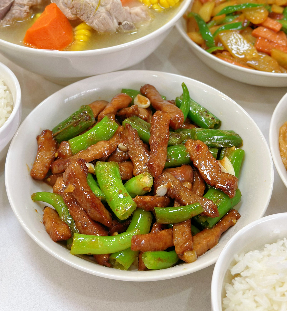 装盘上桌,青椒油绿,牛柳酱红,蒜末星星点点嵌在其中。夹一筷子,肉条嫩滑,青椒脆爽,蒜香浓郁,几种味道在嘴里层层展开。牛肉的鲜嫩是第一层,咬下去能感觉到肉质的弹牙;青椒的清香是第二层,微微的辣意在舌尖散开;最后是蒜香和酱香的回味,久久不散。