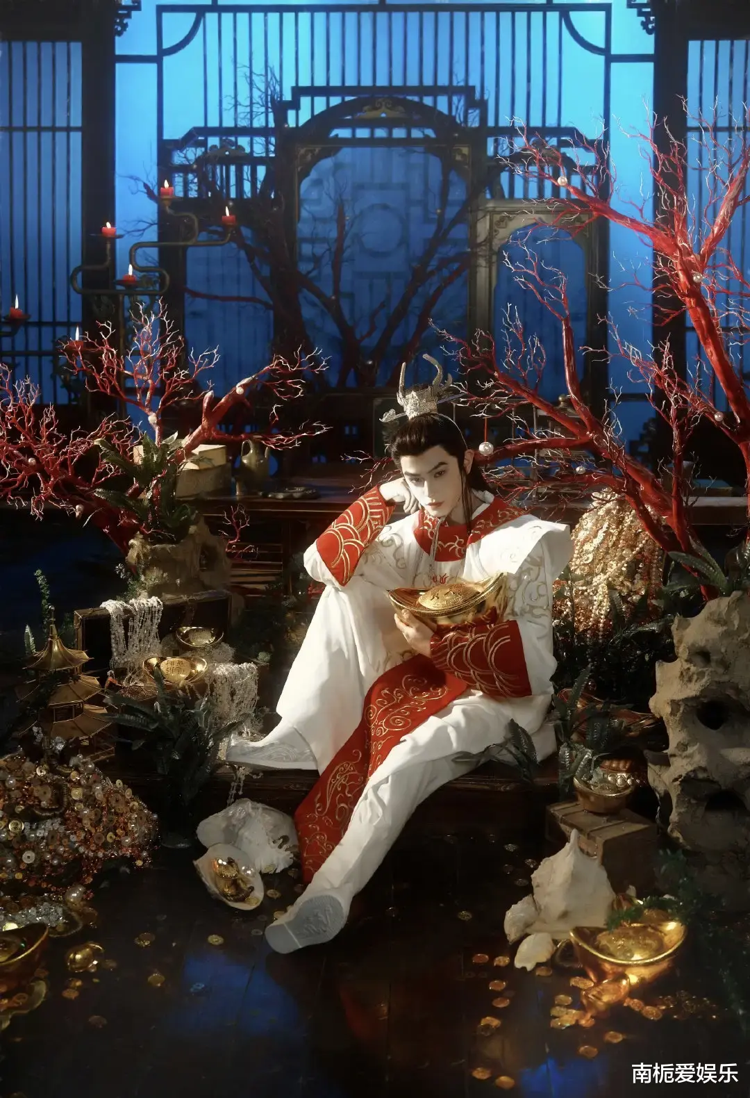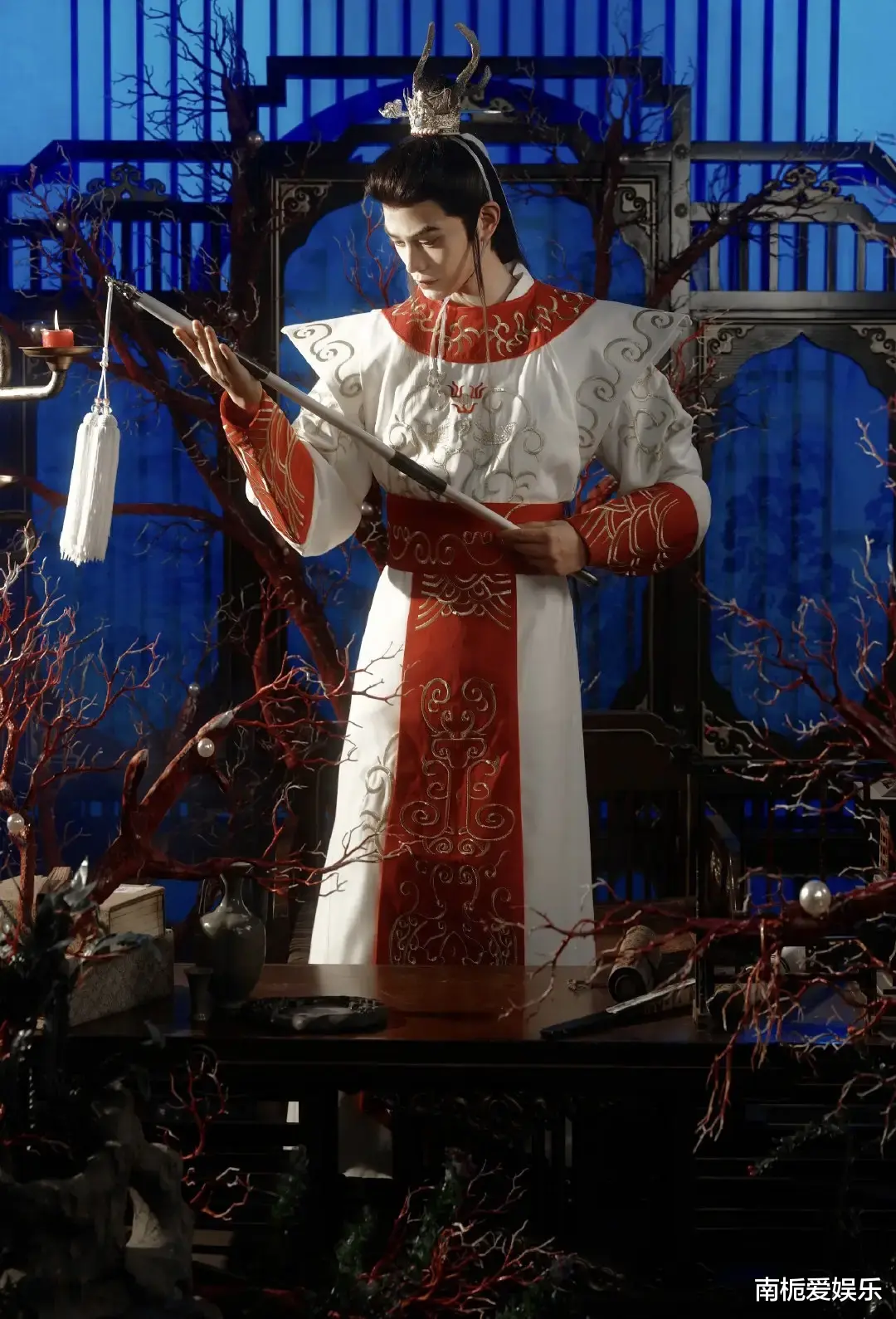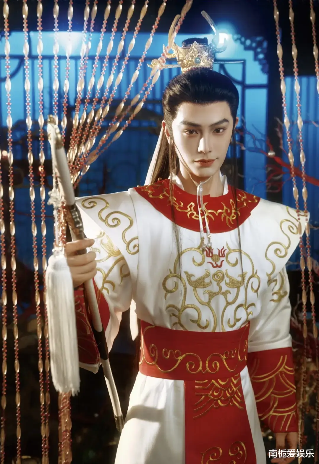 这组造型的细节,真的能看出满满的诚意。丁禹兮身穿一袭飘逸的白衣鳞纹长袍,头戴的银质龙角发冠采用了非遗錾刻工艺。额头上那抹月牙形的花钿,手里牵着的雕花缰绳,甚至连背景里的夜明珠、珊瑚树,都精准还原了老版《西游记》里龙宫的神秘氛围。配合冷调的光影和滤镜,整个人就像是从神话画卷里走出来的一样,既有龙太子的矜贵疏离,又透着股少年人的灵动清爽。