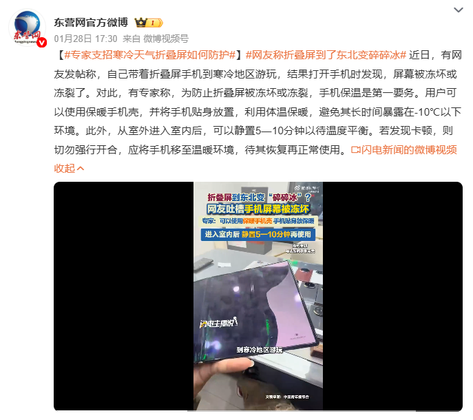 折叠屏手机“怕冷”,早已不是什么新鲜事,由于低温环境下屏幕材料的物理特性变化,极易导致折叠屏手机翻折过程中折痕加深,进而屏幕损坏。像近期“专家支招寒冷天气折叠屏如何防护”、“网友称折叠屏到了东北变碎碎冰”等话题便频频登上热搜,相对的如何在低温环境下正确使用,并且规避屏幕损坏,成了每一位折叠屏用户的“必修课”。