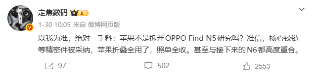 多方爆料指出,为攻克折叠屏折痕,苹果在开发首款折叠屏iPhone Fold的过程中,深度拆解并研究了OPPO Find N5,最终得出的结论是,OPPO在铰链精密结构、屏幕堆叠与折痕控制上的解决方案,目前无法实现复刻、超越。